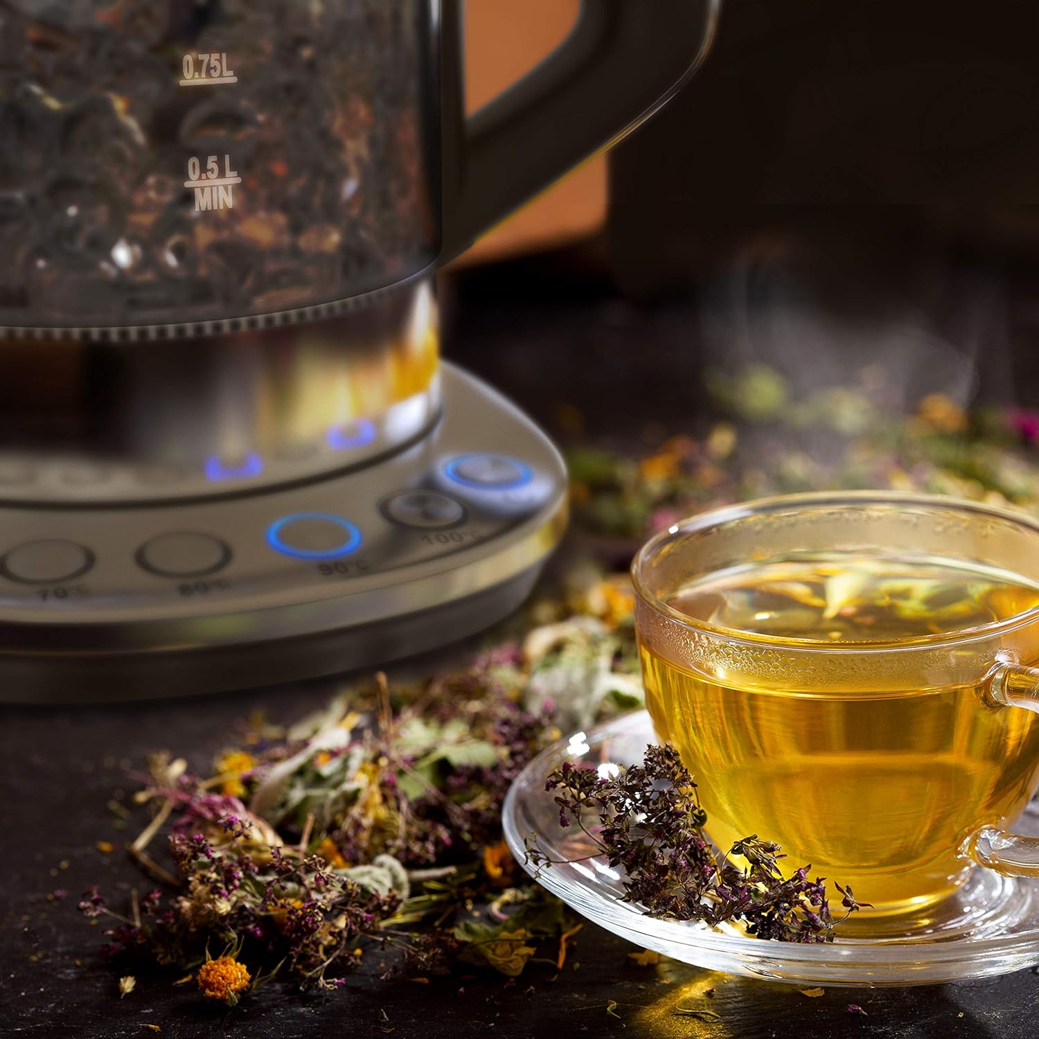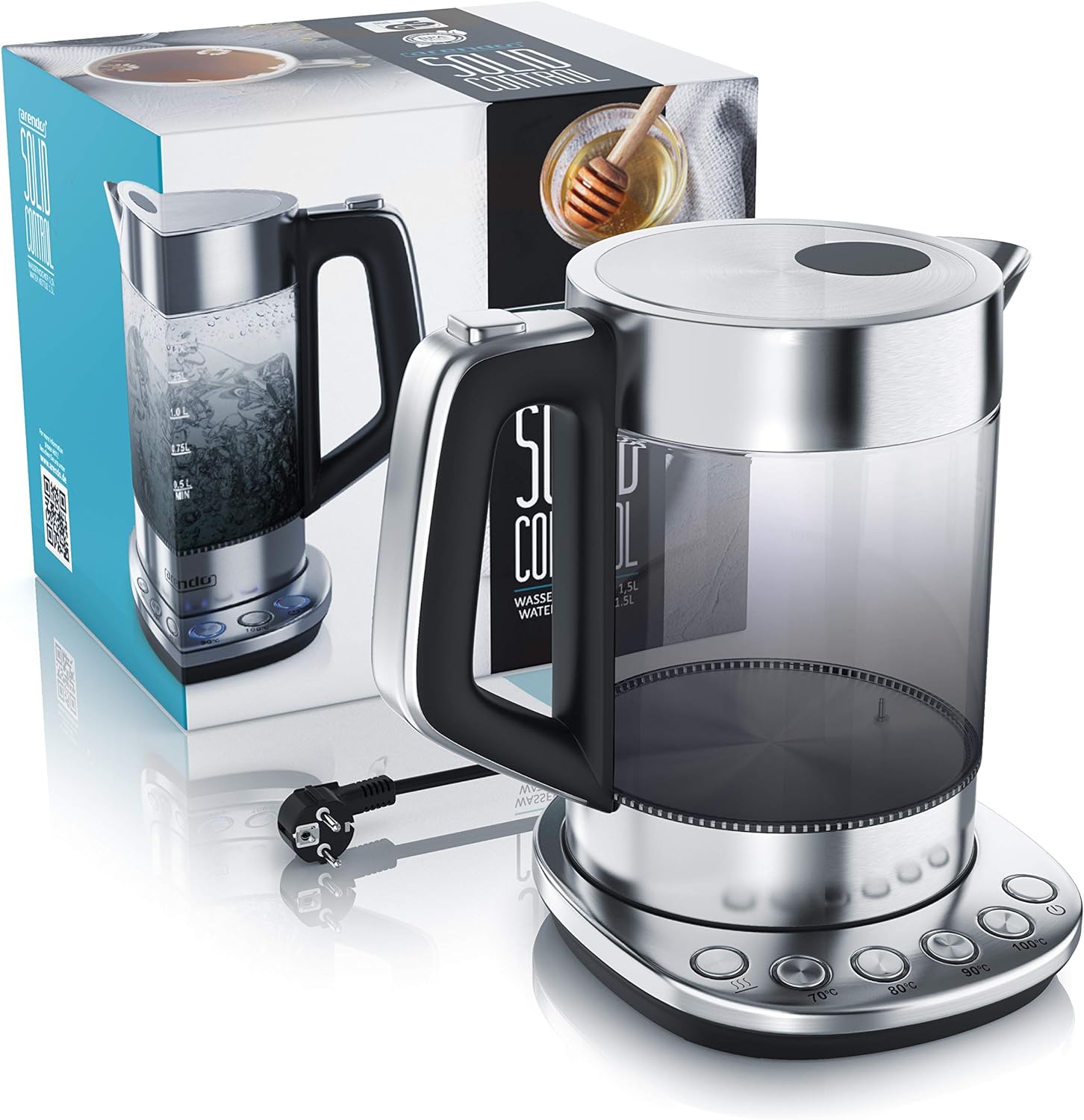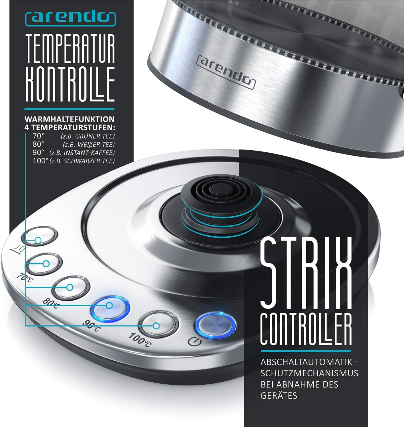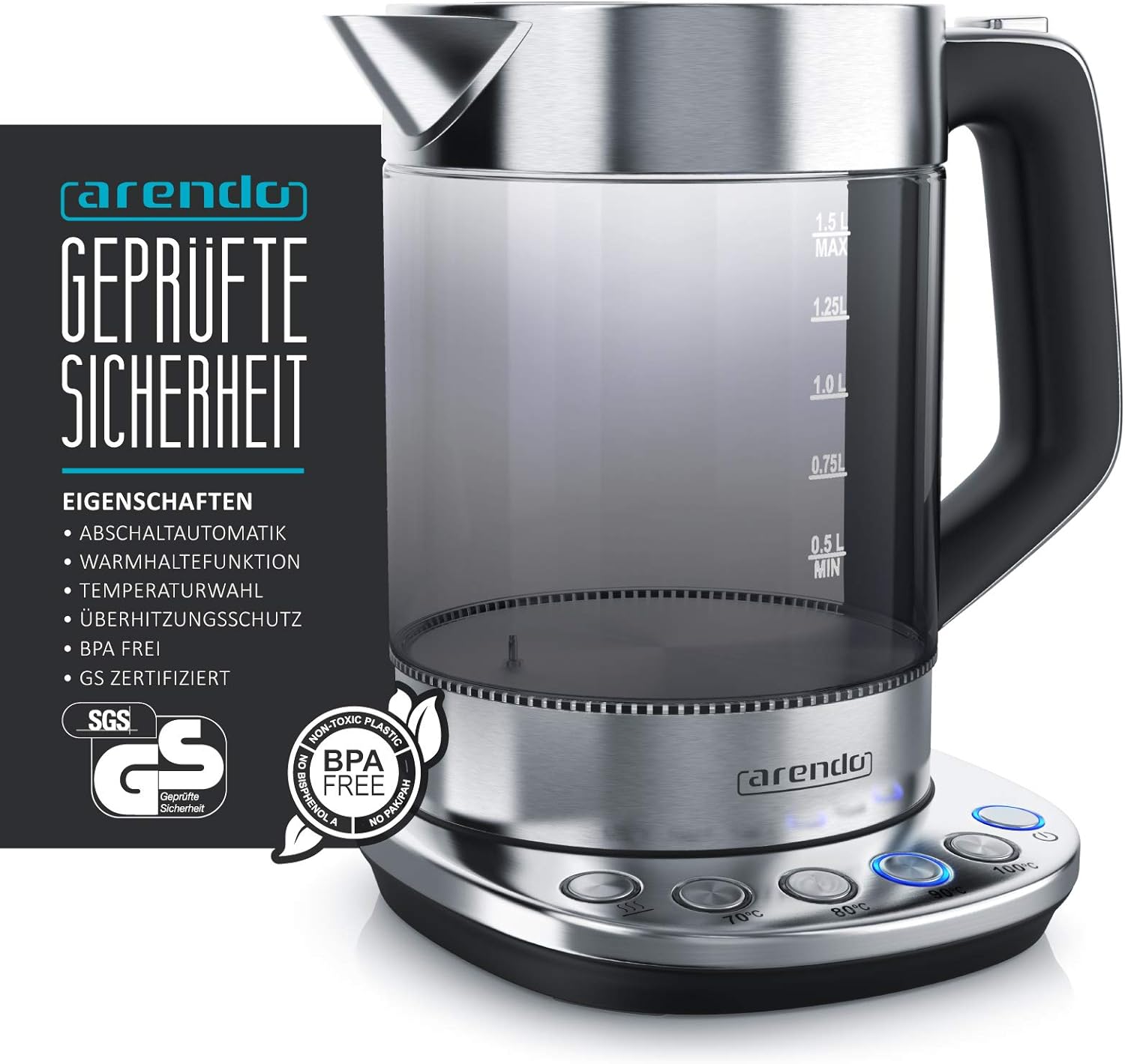 Arendo - Rauchglas Glas Wasserkocher mit Temperatureinstellung - Edelstahl - Warmhaltefunktion 30min