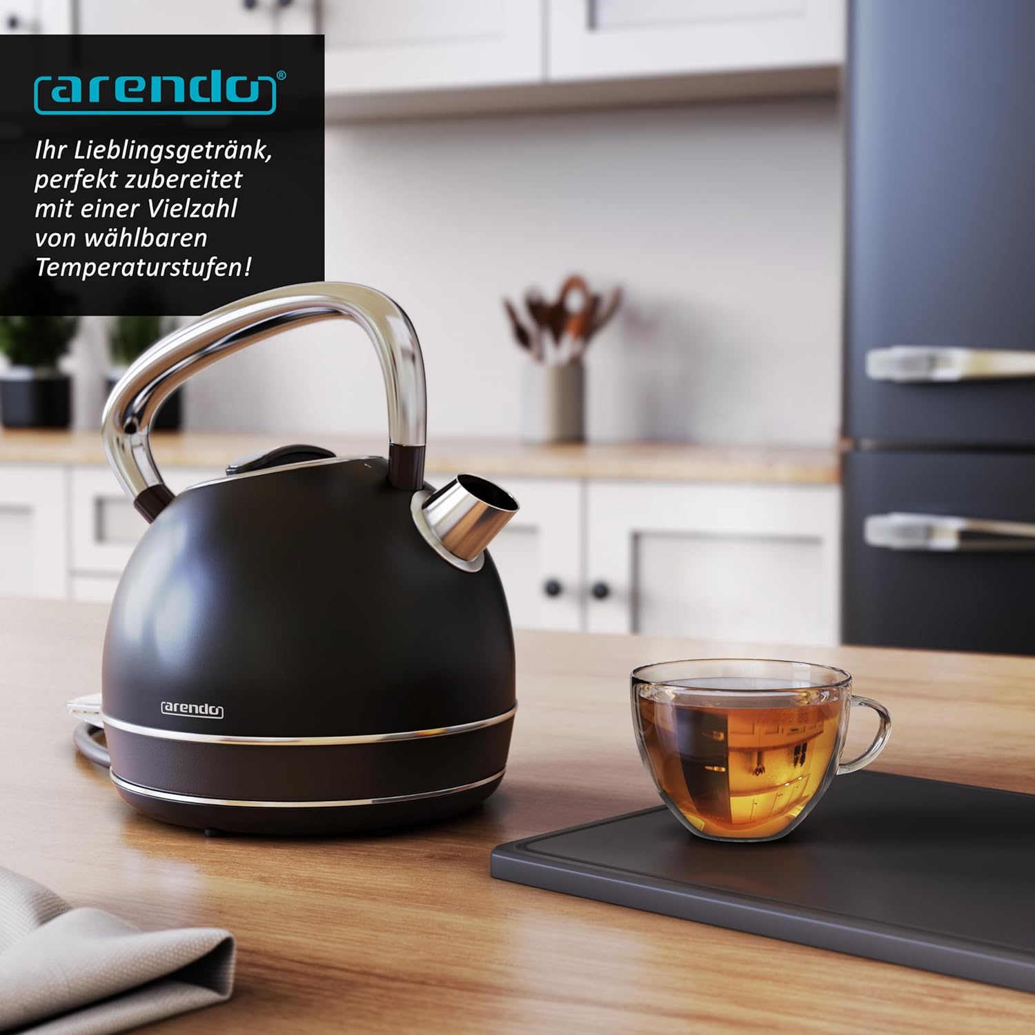 - WASSERKOCHER IM KLASSISCHEN VINTAGE-DESIGN. Bringen Sie einen Hauch von Retrocharme in Ihre Küche! Und geniessen Sie zugleich den Komfort moderner Technologie! Beides vereint im 2200 Watt starken 1,7 Liter Wasserkocher von Arendo. Bringt Ihr Wasser in