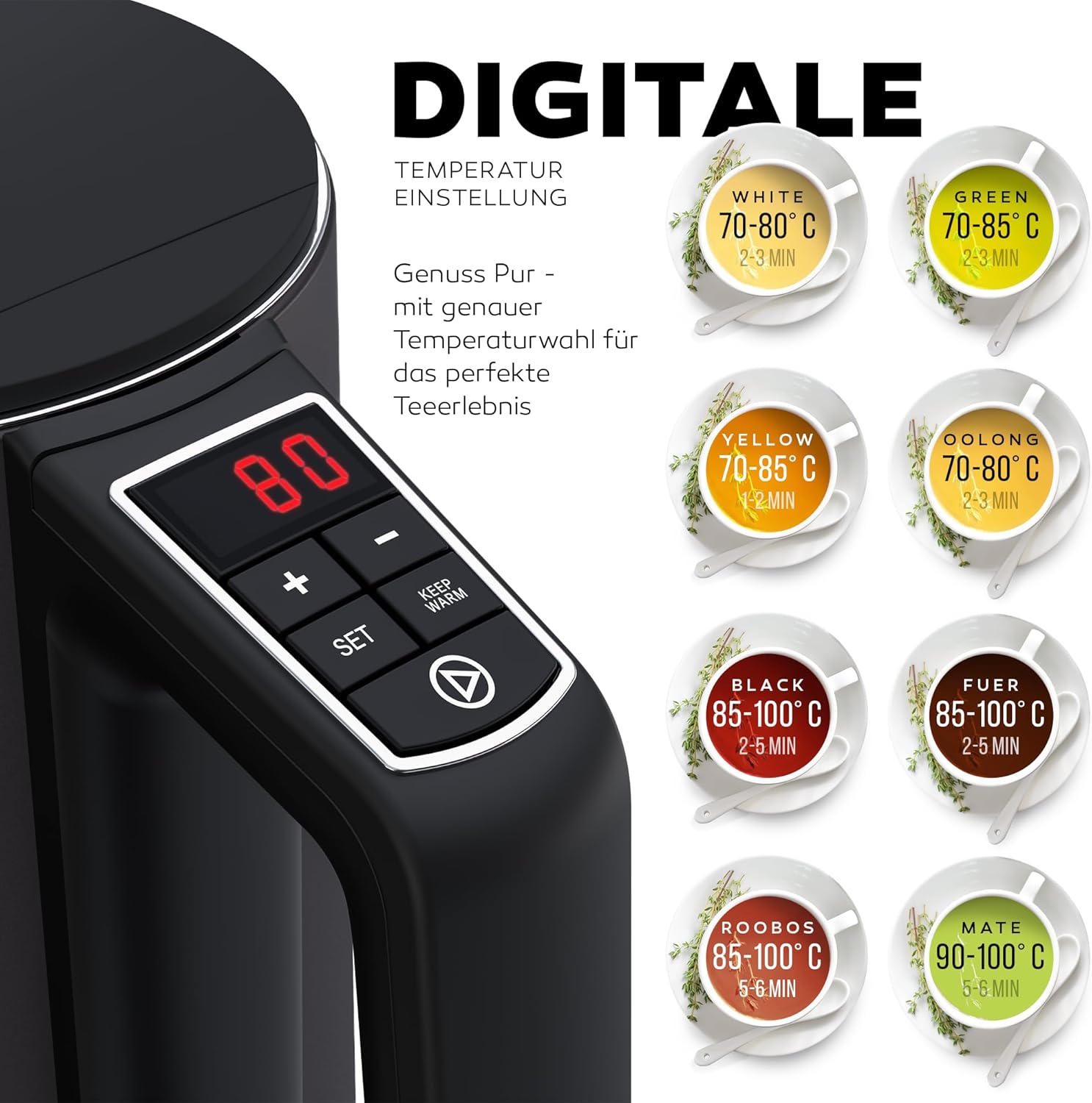 - SCHNELLES & EFFIZIENTES AUFKOCHEN – 1,5 LITER KAPAZITÄT: Mit optimalen 1,5 Liter Fassungsvermögen und 2200W Leistung sorgt der Wasserkocher mit Temperaturwahl für besonders schnelles und energiesparendes Aufkochen. Weniger Wartezeit, mehr Komfort