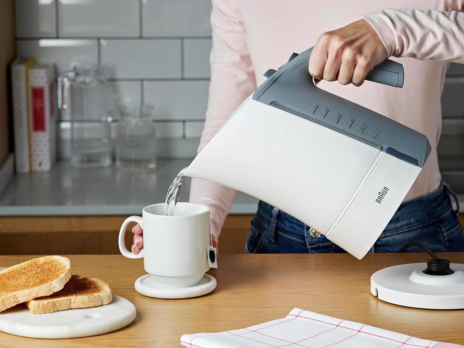 - 4-WEGE-SICHERHEITSSYSTEM Der Wasserkocher verfügt über eine automatische Abschaltung für mehr Sicherheit. Er geht aus, wenn das Wasser kocht, der Deckel geöffnet ist, der Wasserkocher leer ist oder wenn er vom Heizsockel genommen wird