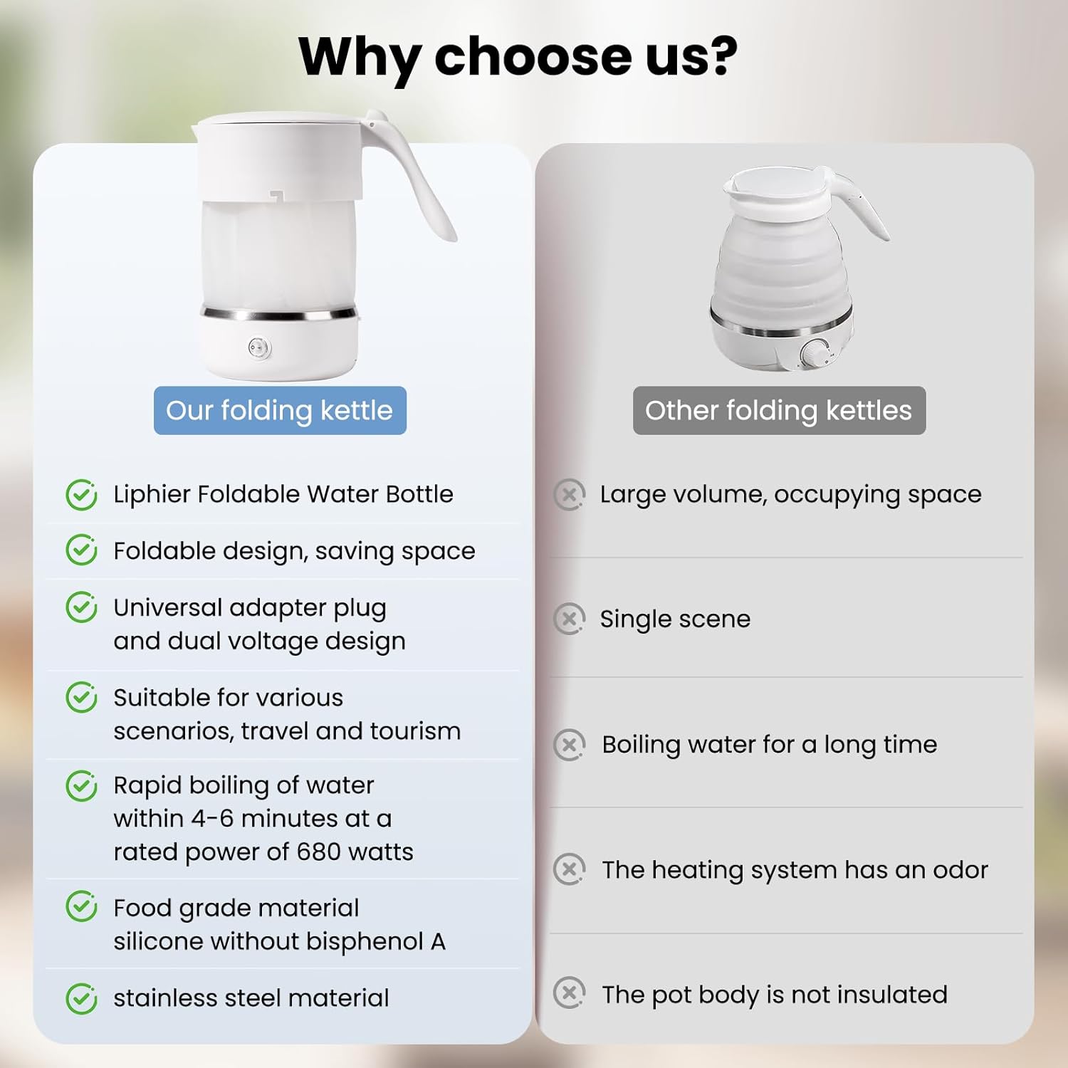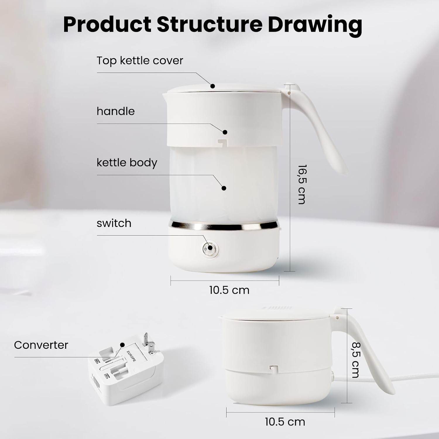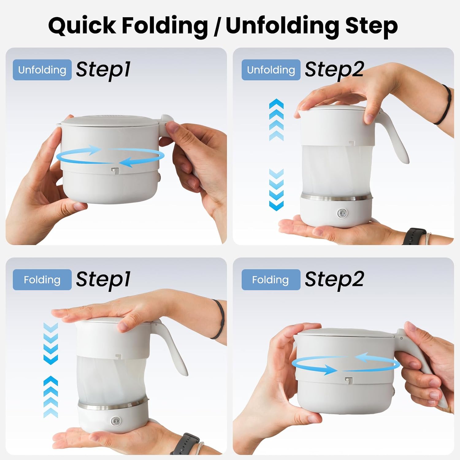 - Der zusammenklappbare, leichte Wasserkocher hat eine Höhe von 170 mm (6,7 Zoll) und kann im Uhrzeigersinn auf 80 mm (3,75 Zoll) zusammengeklappt werden. Er spart 50% Platz und ist ein guter Reisebegleiter