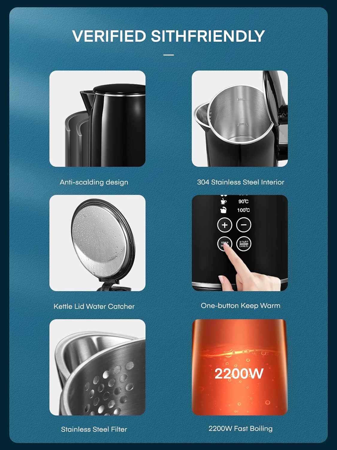 - 🍀【Benutzerfreundlich】: Edelstahl wasserkocher mit temperatureinstellung ist nicht nur funktional, sondern auch ein Hingucker in jeder Küche. Mit 2200 Watt ist er besonders leistungsstark und kocht in Minuten Wasser für Tee, Kaffee oder