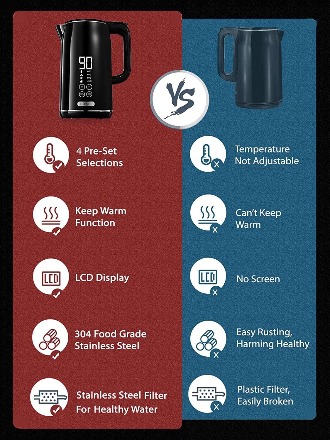 - 🍀【Wärmeerhaltungs Funktion】:Der 1.7L schwarze wasserkocher kann 240 Minuten lang bei der ausgewählten temperatur warm bleiben, und der Betriebsstatus des Wasserkochers wird auf dem LED-Bildschirm angezeigt, sodass Sie nicht wiederholt Wasser