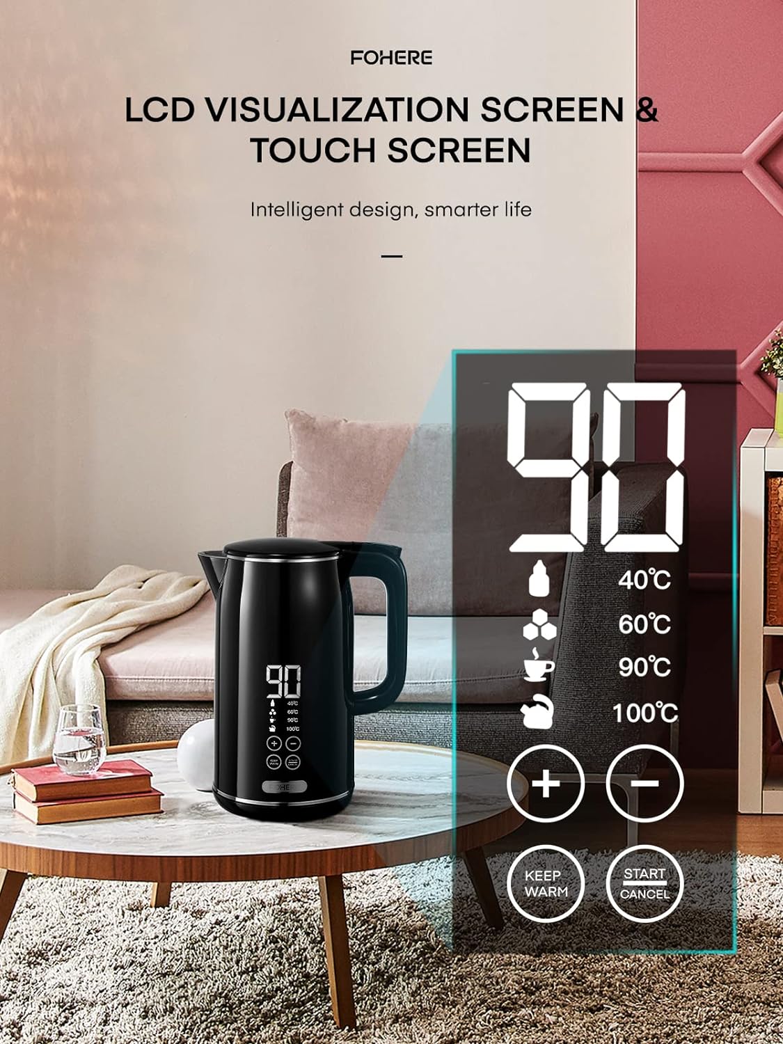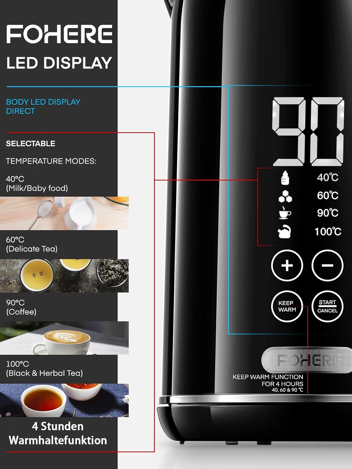 - 🍀【Intelligente LED-Anzeige】:Wasserkocher mit temperatureinstellung das LED-Digitalbildschirmanzeige mit mehreren heizoptionen von 40 °C bis 100 °C. Die weisse LED leuchtet beim Einschalten und die schwarze Oberfläche des Gehäuses sorgt für