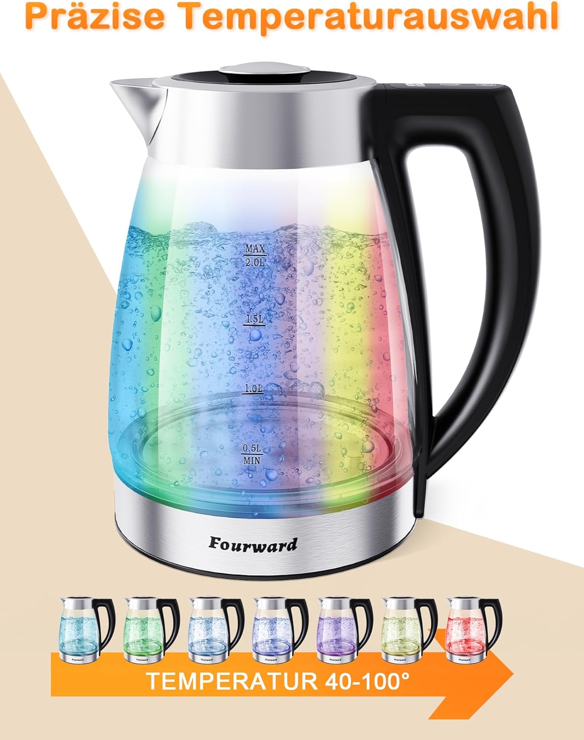 - Grosses Fassungsvermögen: Mit einem beeindruckenden Fassungsvermögen von 2,0 Litern ermöglicht der Fourward Wasserkocher das Aufkochen grosser Wassermengen. So können Sie mühelos eine Tasse Tee für die ganze Familie oder eine Gruppe von Freunden