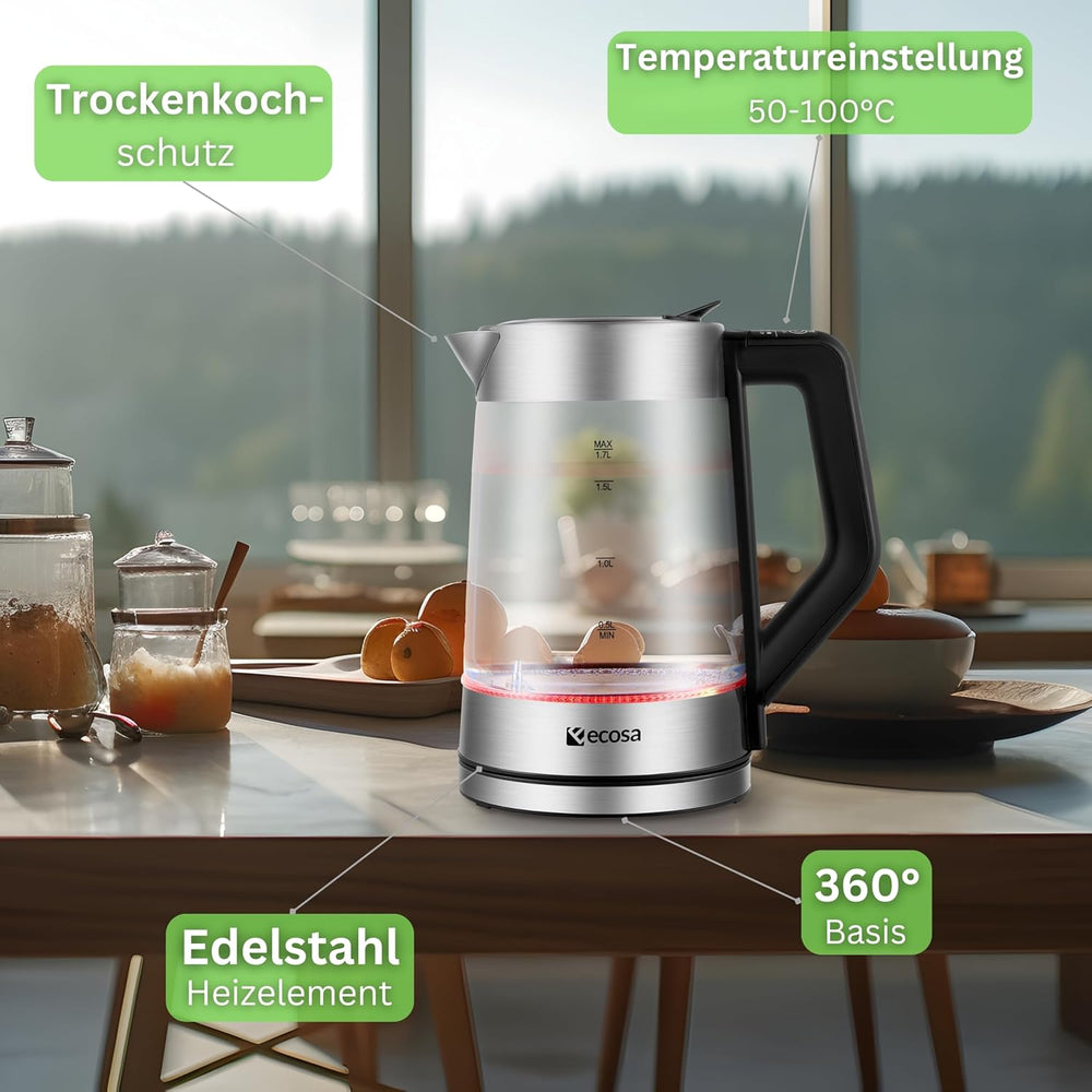 - Highlights: Glas/Edelstahl Hochwertiger Edelstahlboden mit verdecktem Heizelement Entkalkungsfilter Temperatureinstellung von 60°C - 100°C Chlorentfernungsfunktion in 3 Minuten Verschiedene LED-Farben in Abhängigkeit der gewählten Temperatur. Einfache Handhabung durch kabelloses Design Wasserstandsanzeige Fassungsvermögen: 1,7 Liter 360° drehbarer Kontaktsockel für Rechts- und Linkshänder Überhitzungsschutz Trockenkochschutz Automatische und manuelle Abschaltung