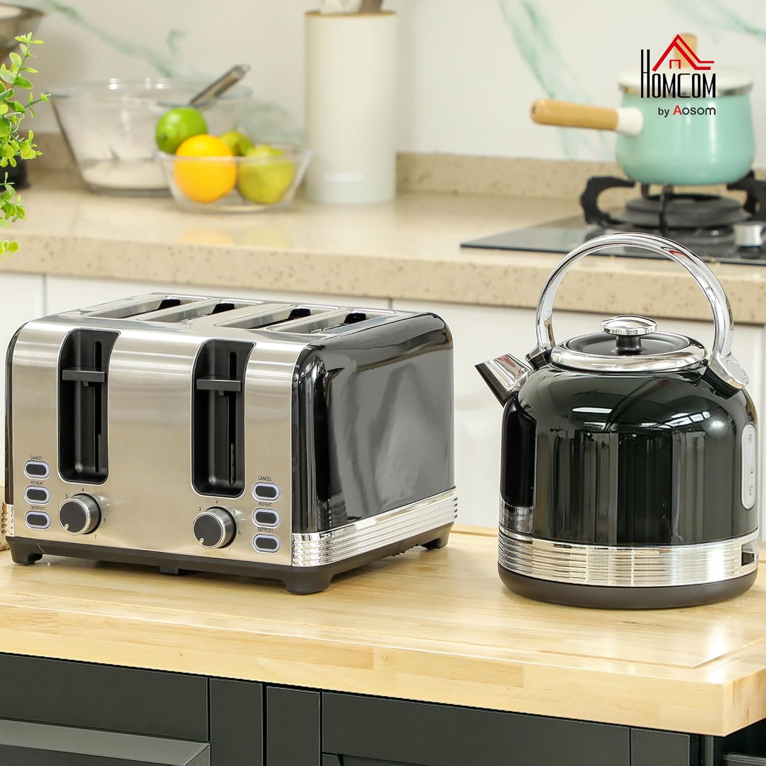 - Retro-Eleganz: Dieses Set aus schwarzem Wasserkocher und 4-Scheiben-Toaster verfügt über einen polierten Chromgriff, gerippte Metalldetails und eine zeitlose, abgerundete Silhouette. Sein raffiniertes, vintage-inspiriertes Design verleiht ihm einen