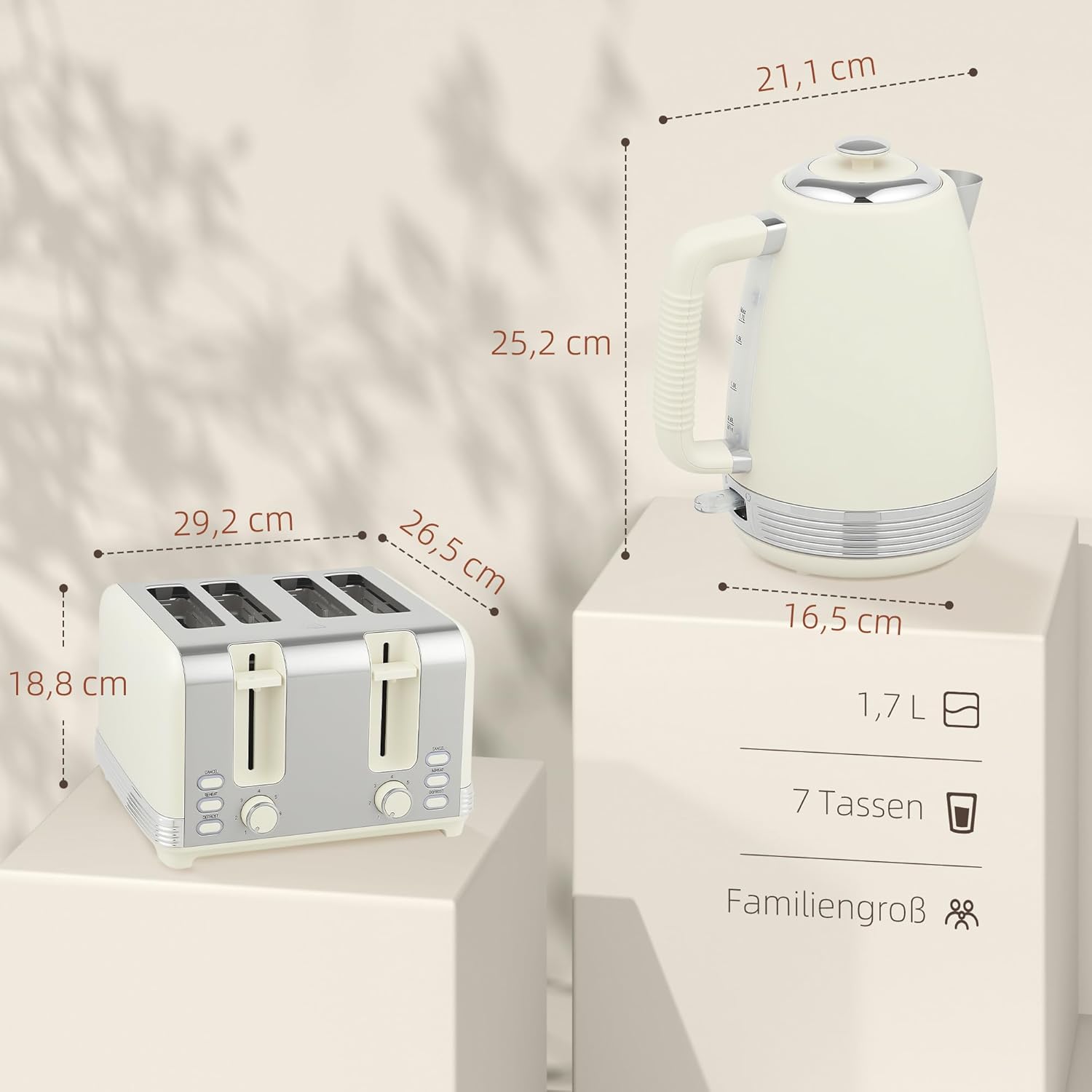 - Stilvolles Design: Elegante Cremefarbe und Edelstahl mit silbernen Akzenten, ideal für jede Küchenästhetik. Dieses 4-Scheiben-Toaster und Wasserkocher-Set ist ein ideales Geschenk für Einweihungspartys, Hochzeiten oder für frischgebackene