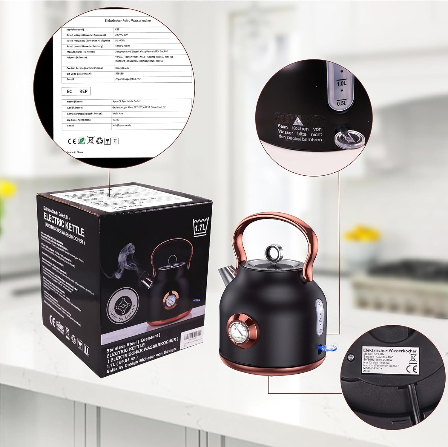 - ☛ 【1,7 L Grosses Fassungsvermögen & Retro-Design】Dieser elektrische Teekessel kann 8 Tassen Wasser erhitzen, indem er den Netzschalter beleuchtet, wenn er eingeschaltet ist, und ihn automatisch ausschaltet, sobald er fertig ist. One-Touch-Tasten