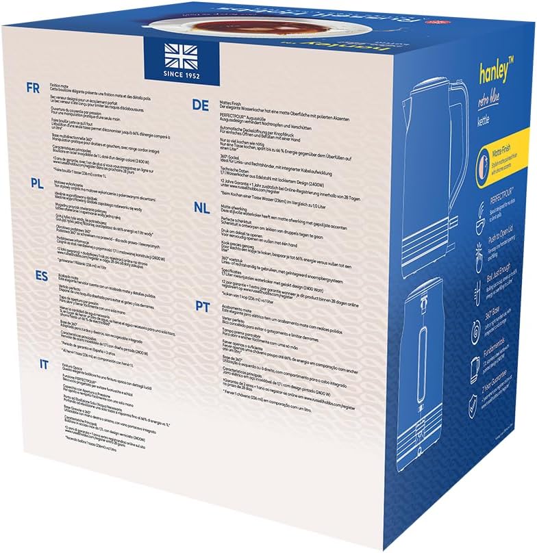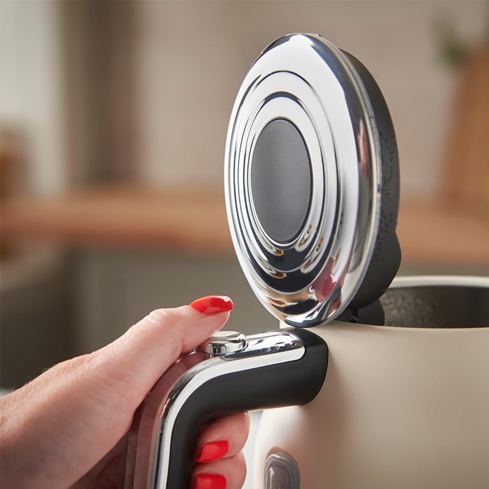 - "RETRO DESIGN - Der Hanley Wasserkocher überzeugt mit seinem matten, cremefarbenen Design mit Chromakzenten im Vintage/Retro Stil und ist ein echter Blickfang in jeder Küche. 1,7l Fassungsvermögen und eine sichtbare Wasserstandsanzeige ermöglichen