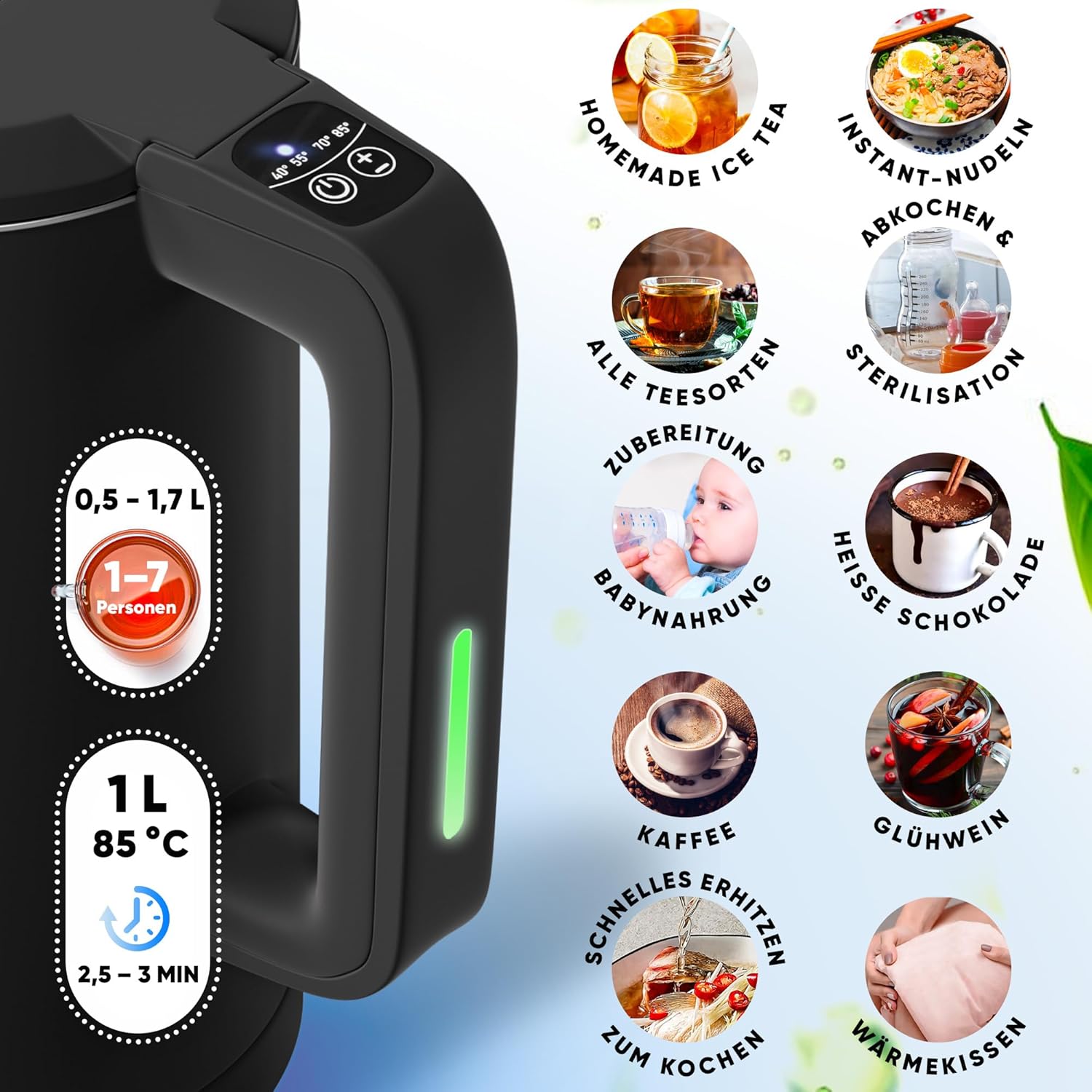 - 💯 PRÄZISE TEMPERATURKONTROLLE & VIELSEITIGKEIT: Die präzise Temperaturkontrolle ermöglicht es, die ideale Wassertemperatur einzustellen, wodurch der Wasserkocher vielseitig für die Zubereitung von Tee, Kaffee, und mehr wird.