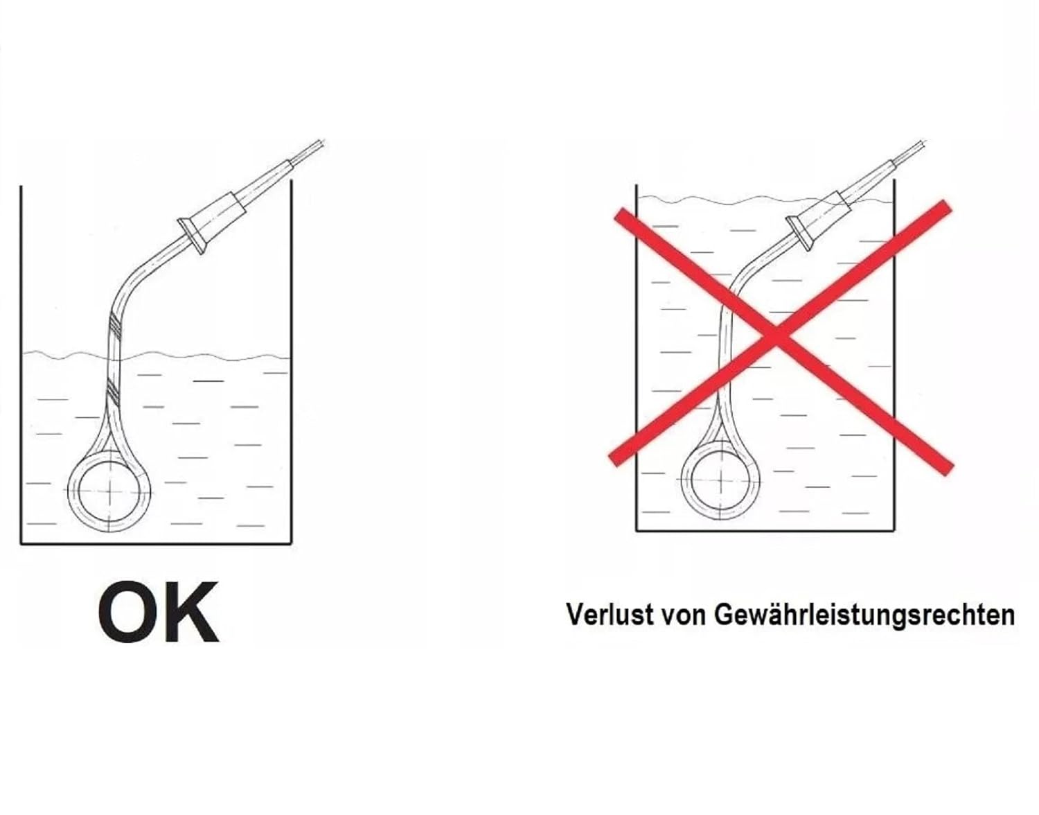 - AUFMERKSAMKEIT! Diese Tauchsieder ist nicht geeignet für kochendes Wasser in kleinen Behältern wie Glas oder eine kleine Tasse.