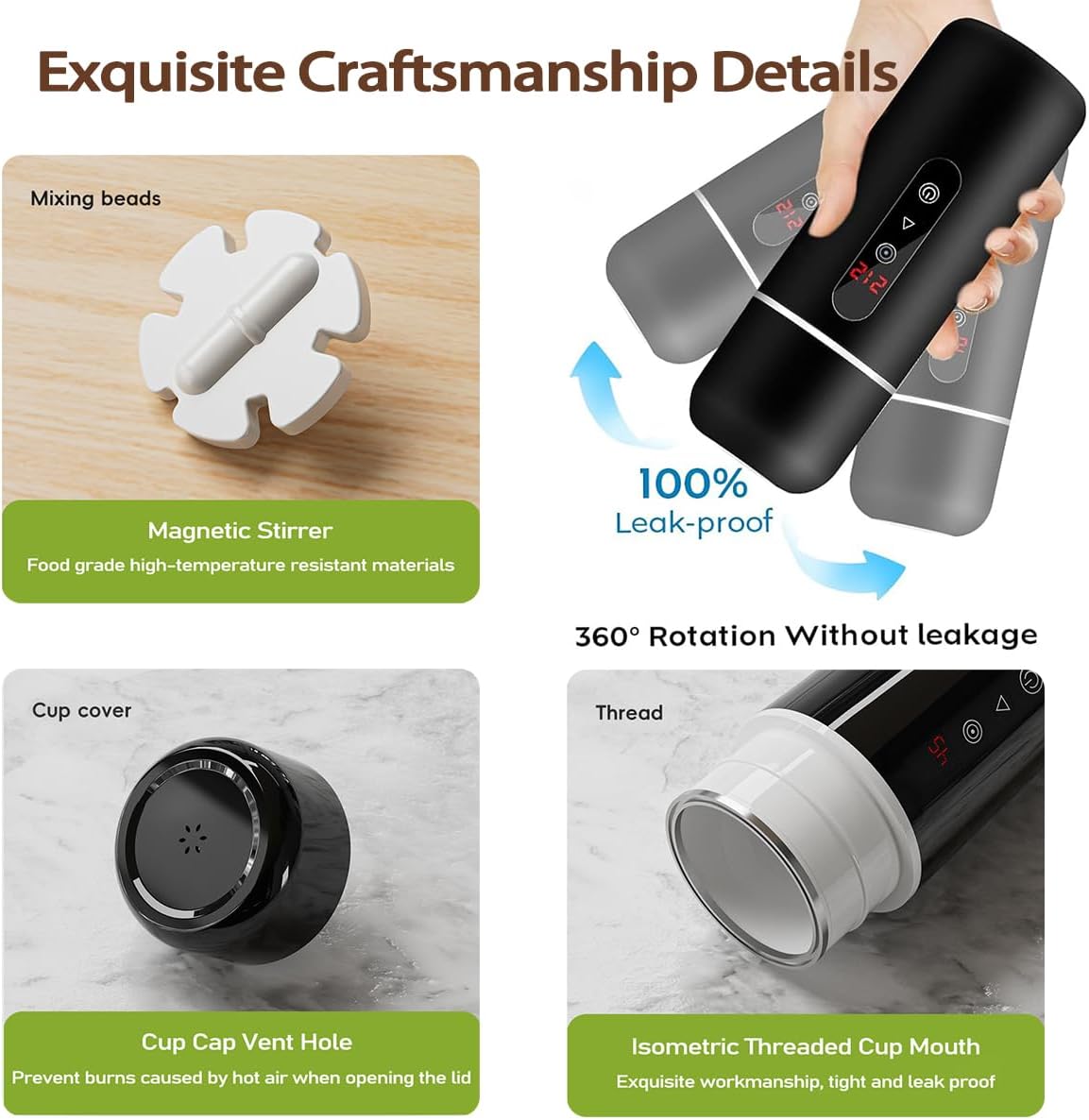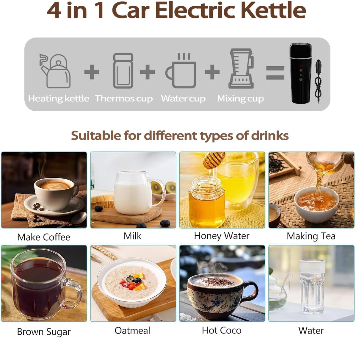 - Tragbarer Auto Wasserkocher mit Magnetisches Induktionsrühren: Dieser Autokessel verfügt über einen eingebauten magnetischen Induktionsrührer, um sicherzustellen, dass Ihre Lieblingsgetränke vollständig gerührt werden, wie Kaffee, Milchpulver, Tee