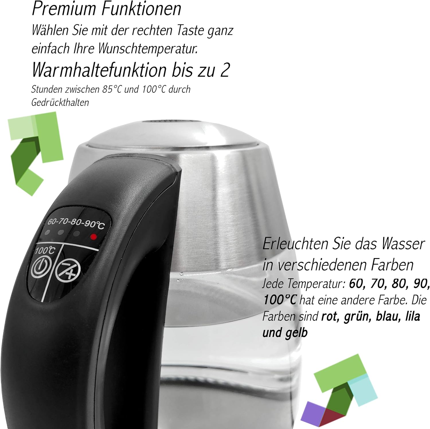 - ✔ MAXIMALE QUALITÄT & PERFORMANCE: Alle Elemente des Premium-Wasserkochers sind passgenau verbaut. Feinstes Edelstahl sowie besonderes Spezialglas mit erhöhtem Schmelzgrad sorgen für Langlebigkeit. Der stilvoll beleuchtete 1,8 L voluminöse Innenraum ist dauerhaft schmutzabweisend und bleibt dank der einzigartigen Dunstabzugstechnologie von aussen schön klar. Schadstofflose Benutzung garantiert.