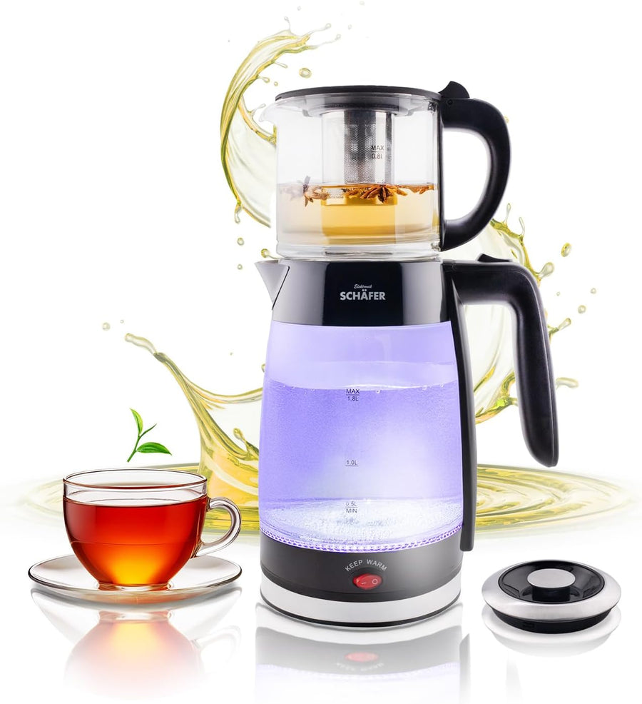 Teekocher Wasserkocher Edelstahl - Schwarz Glänzend - mit Teesieb Abschaltautomatik und Warmhaltefun