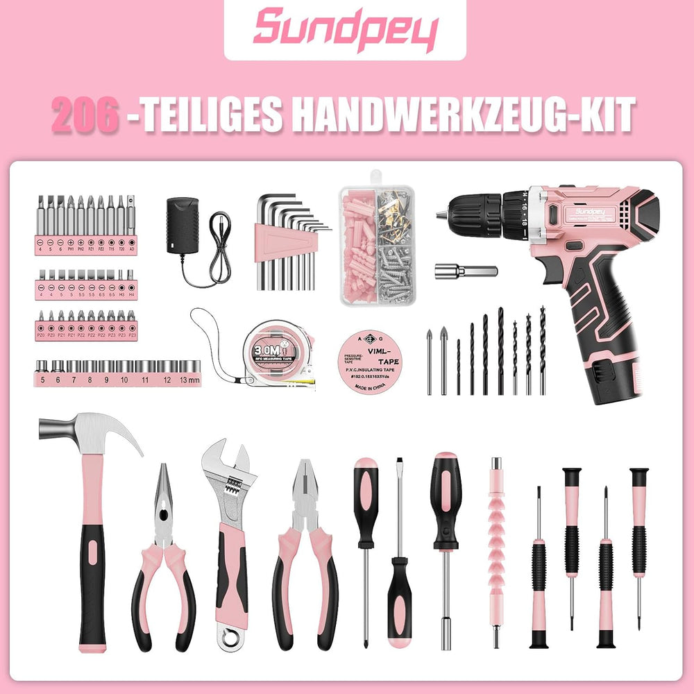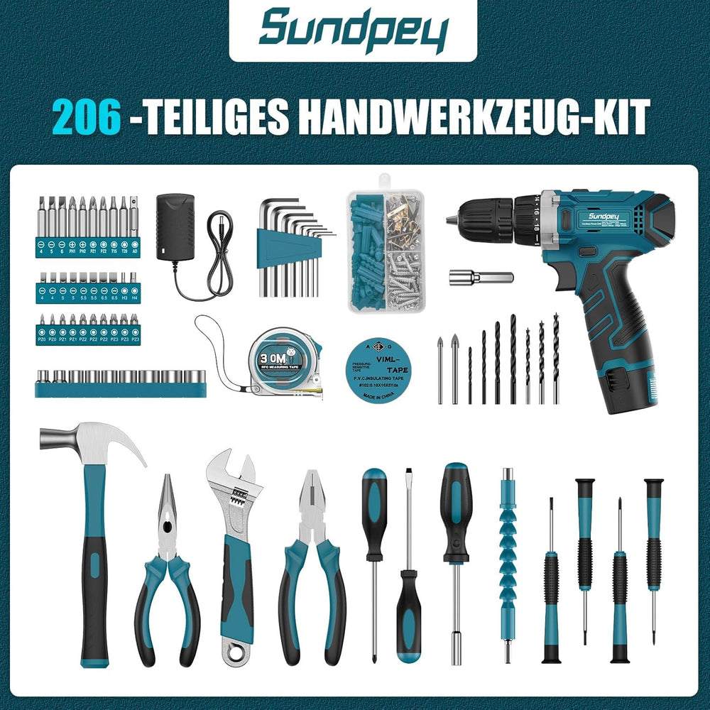 Werkzeugkoffer Gefüllt 206tlg mit 12V Akku Bohrschrauber - Sundpey Akkuschrauber Set, 25+1 Drehmomen