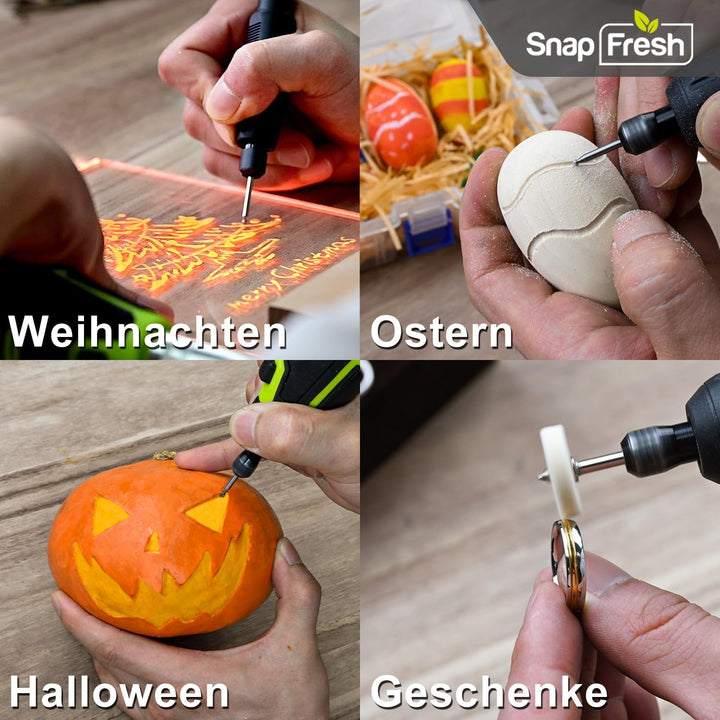 - LEISTUNGSSTARK UND VIELSEITIG: Das SnapFresh Akku-Rotationswerkzeug ist kabellos und mit einem starken Motor ausgestattet. Der 12V Lithium-Ionen-Akku bietet 7 Geschwindigkeitsstufen (5.000 bis 28.000 U/min) für eine Vielzahl von Materialien wie Metall,