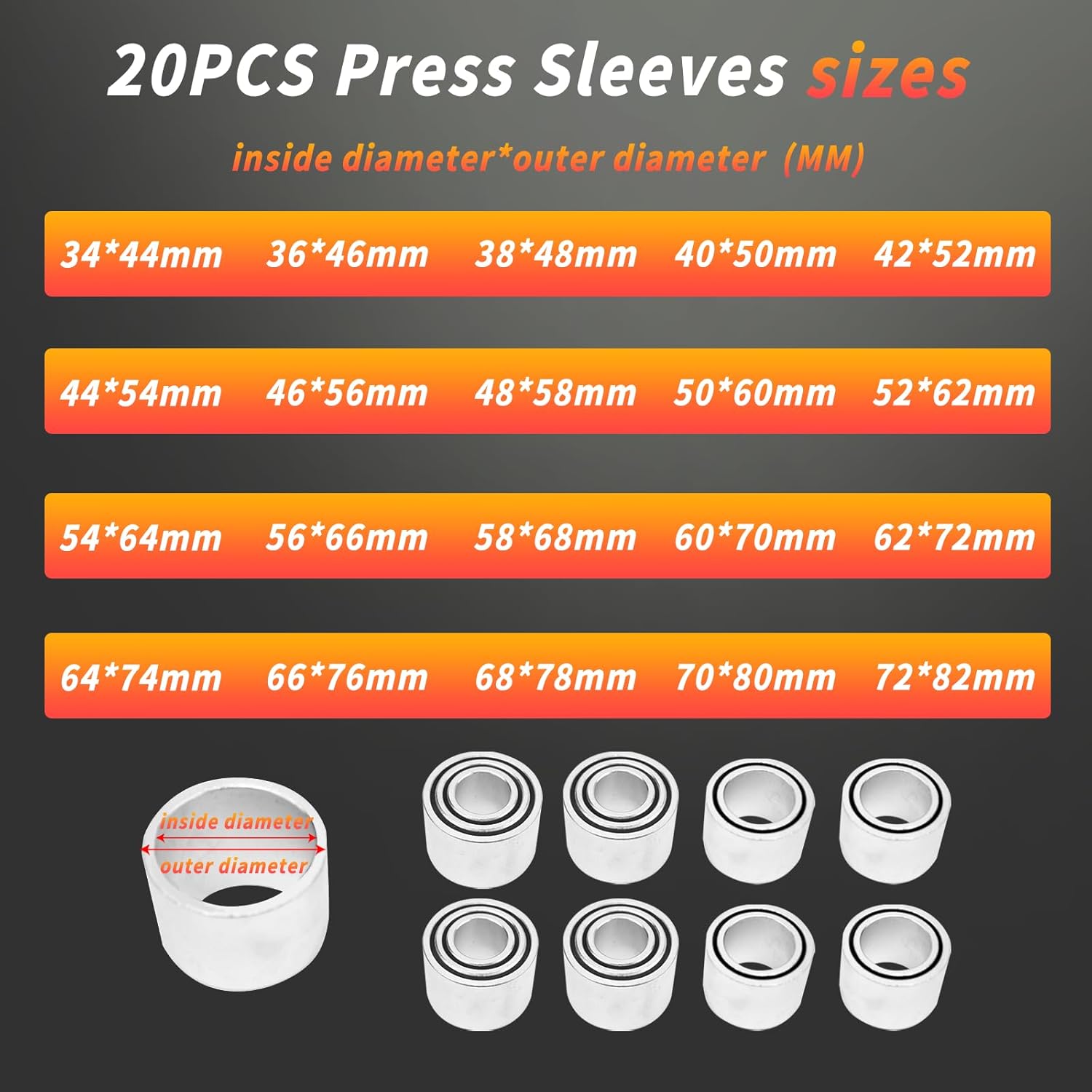 - Paket Enthält: 20 Presshülsen mit Innendurchmesser 34–72 mm, Aussendurchmesser 44–82 mm, Schrittlänge 2 mm, Höhe 55 mm; 4 Zugwellen mit Muttern und Drucklagern (M10.M12.M14. M16); 4 x Stufentabletts; 1 Werkzeug-Aufbewahrungsbox.