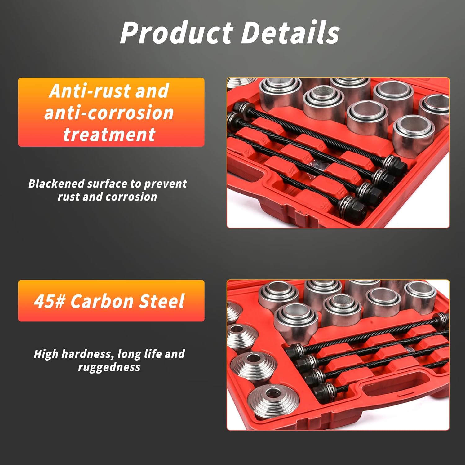 - Qualität Silentlager Werkzeug : Das Material aus kohlenstoffreichem Stahl ist hochtemperaturvergütet und insgesamt wärmebehandelt, mit hoher Härte, Rost- und Korrosionsschutz, robust und langlebig und hat eine lange Lebensdauer.