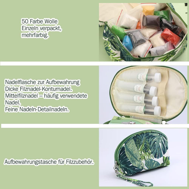 - 【Komplettes Nadelfilz Zubehör】 Hochwertige Naturfilzwolle 50 Farben (ca. 3 g pro Farbe), 1 blaue Schere, 1 Zange, vierteiliges Set mit Farbmuster, Holzgriffe in zwei Grössen, Filznadeln in vier verschiedenen Grössen, 1 Filzunterlage, Fingerschutz und weiteres nützliches Zubehör. Alle Werkzeuge in zwei Taschen, einfach zu transportieren und aufzubewahren.
