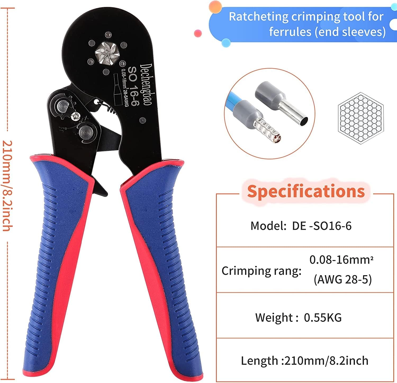 - Aderendhülsen-Crimpzange – Sechskant-Sägezahn-Crimpzange mit selbstjustierender Ratsche für AWG 30–5 (0,08–16 mm²) Kabelendhülsen, langlebige und kompakte Struktur, für isolierte und nicht isolierte Steckverbinder