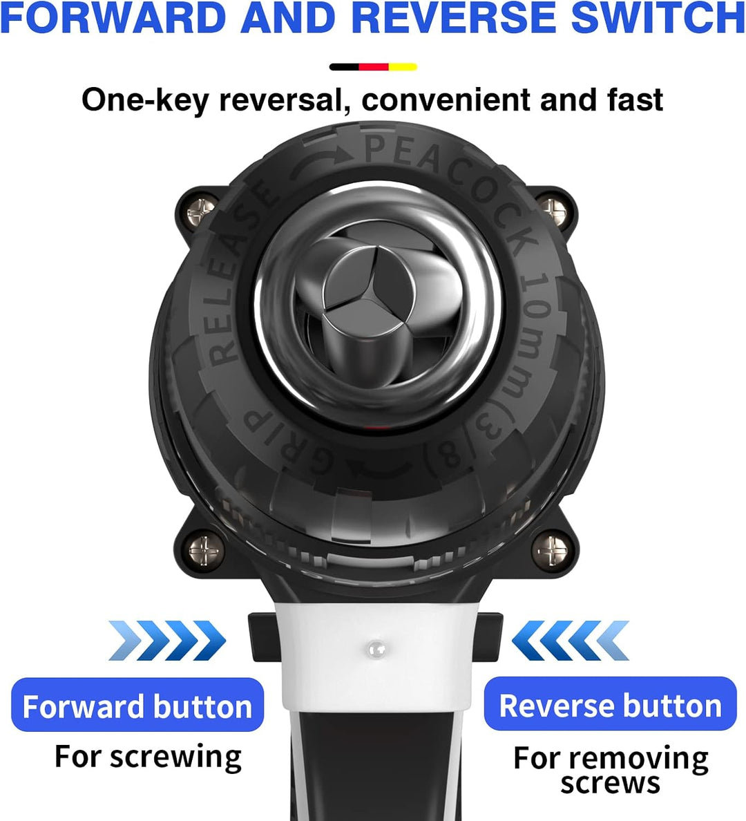 - 【3/8 "Spannfutter und Schnellwechselbohrer】 -3 / 8 "(10 mm) Schnellspannbohrfutter mit Auto-Lock-Spannfutter, ermöglicht das schnelle und einfache Wechseln von Bits mit einer Hand. Der Vorwärts- / Rückwärtsschalter dieses Bohrers steht zum