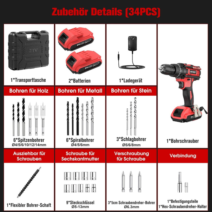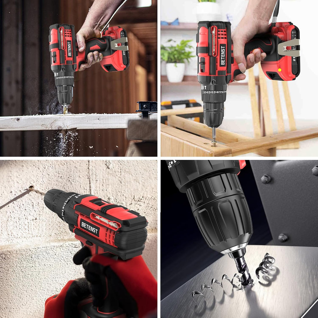 - 【3-in-1 System Bohrhammer & 42N.m Maximales Drehmoment】BETENST Akkuschrauber verfügt über 3 Arbeitsmodi-Schrauben, Bohren und Hammerbohren. Mit einem maximalen Drehmoment von 42 Nm kann der Kombibohrer problemlos Löcher bohren und Schrauben in