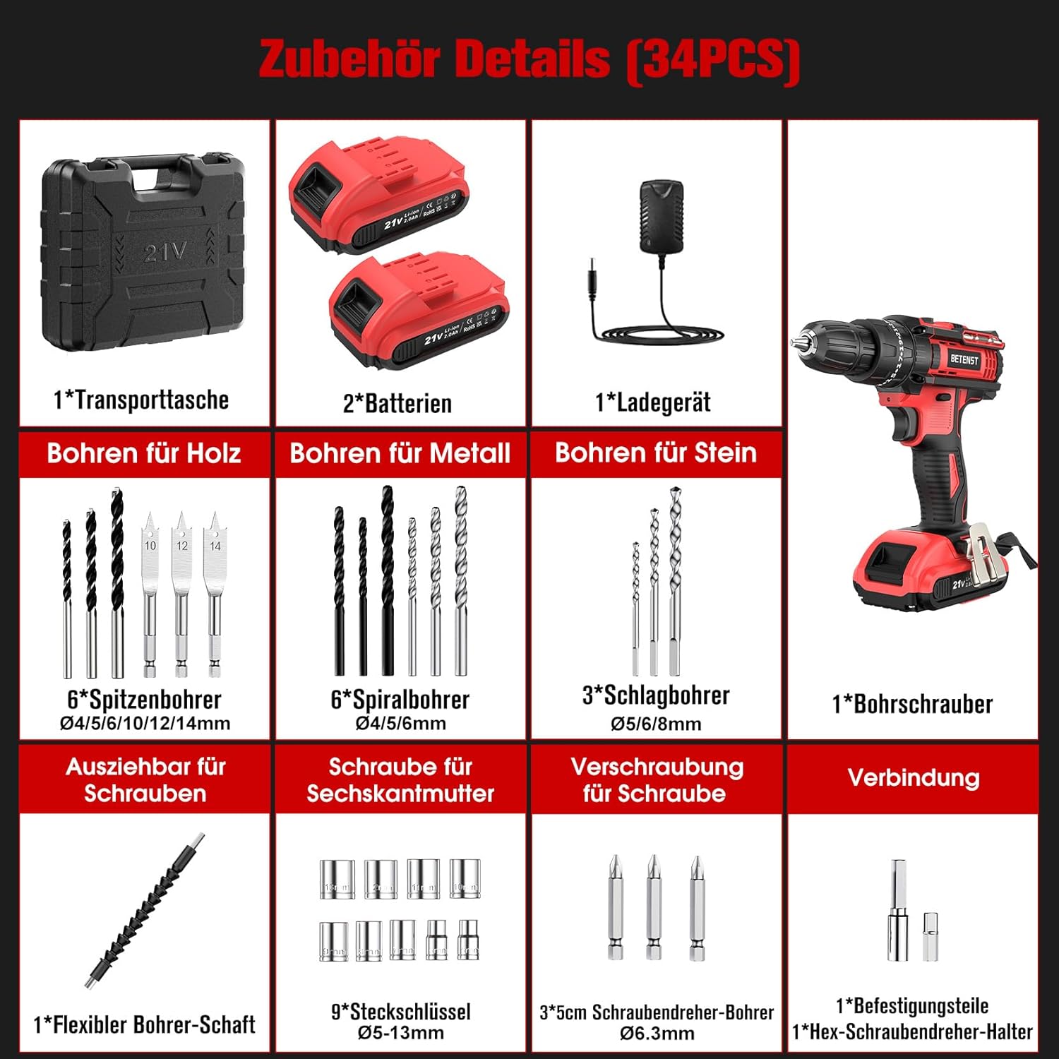 - 【30PCS Hochwertige Bohrer Zubehör Set】Wir bieten Ihnen 30pcs Bohrer Zubehör, das Akku-Bohrschrauber*1, einem 2,0-Ah-Lithium-Ionen-Akku*2, einem Ladegerät*1, einer Tragetasche*1 und einem Benutzerhandbuch*1 geliefert. Brad-Spitzenbohrer*6,