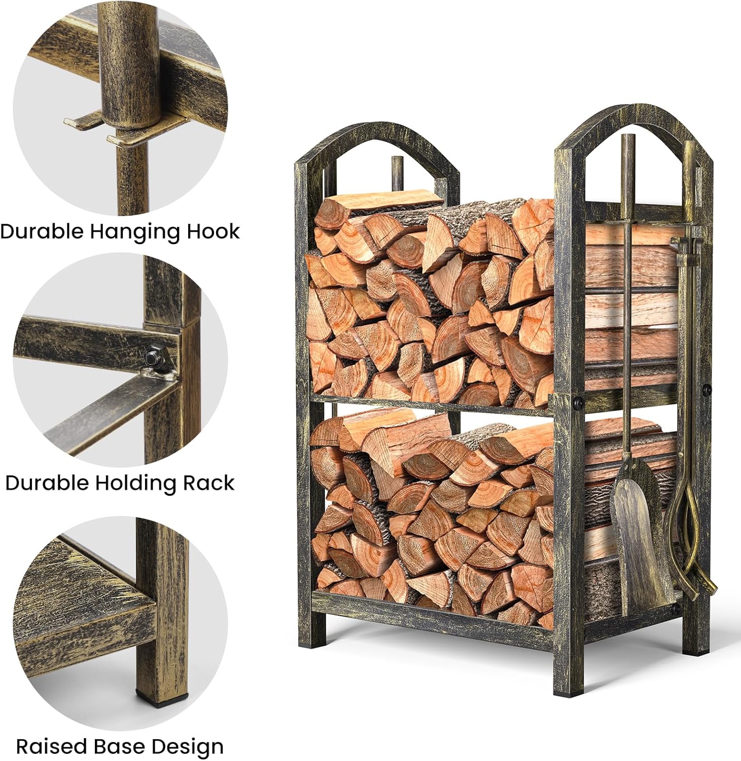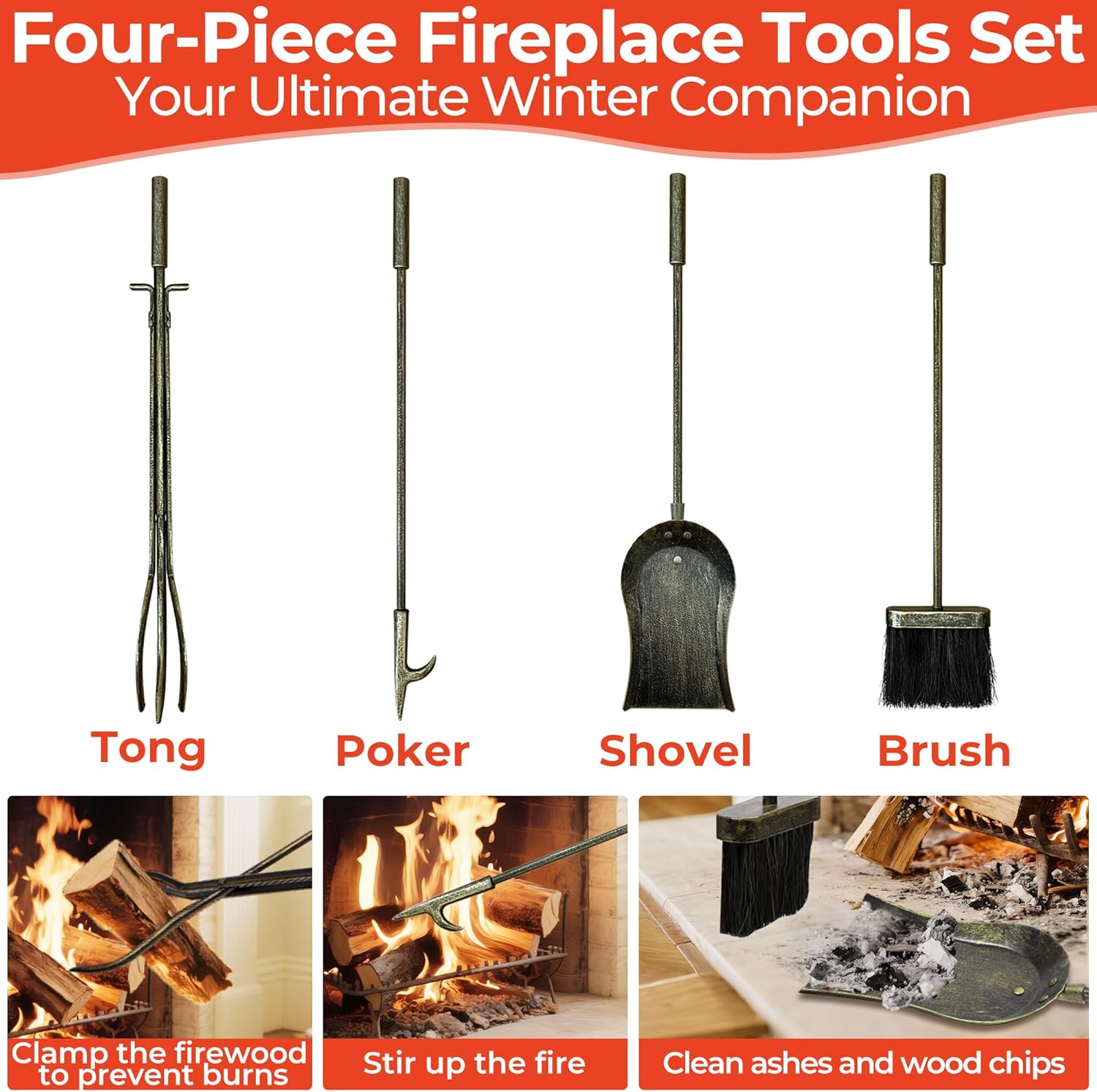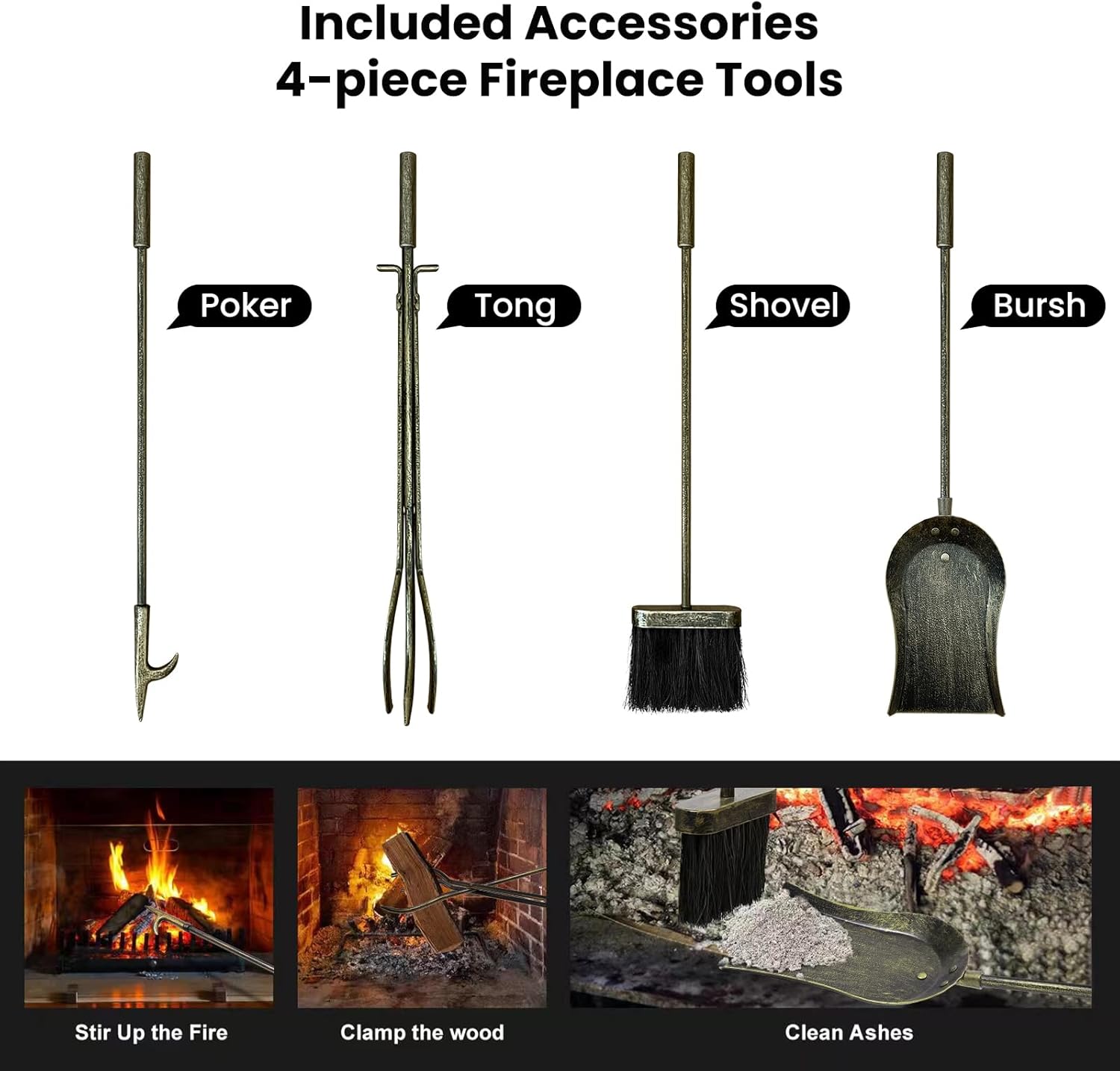- 4 Werkzeuge im Lieferumfang enthalten: Dieses Set mit Haken für alle Ihre Kaminwerkzeuge enthält eine Schaufel, eine Bürste, eine Zange und einen Schürhaken zum sicheren Bewegen und Reinigen von Brennholz sowie eine Stahlablage unter dem Holzregal für Feueranzünder. Das Kaminwerkzeug-Set hält Ihr Brennholz und Ihre Werkzeuge an einem praktischen, schönen Ort. Dieses Paket bietet alles, was Sie für eine organisierte und attraktive Feuerstelle benötigen.
