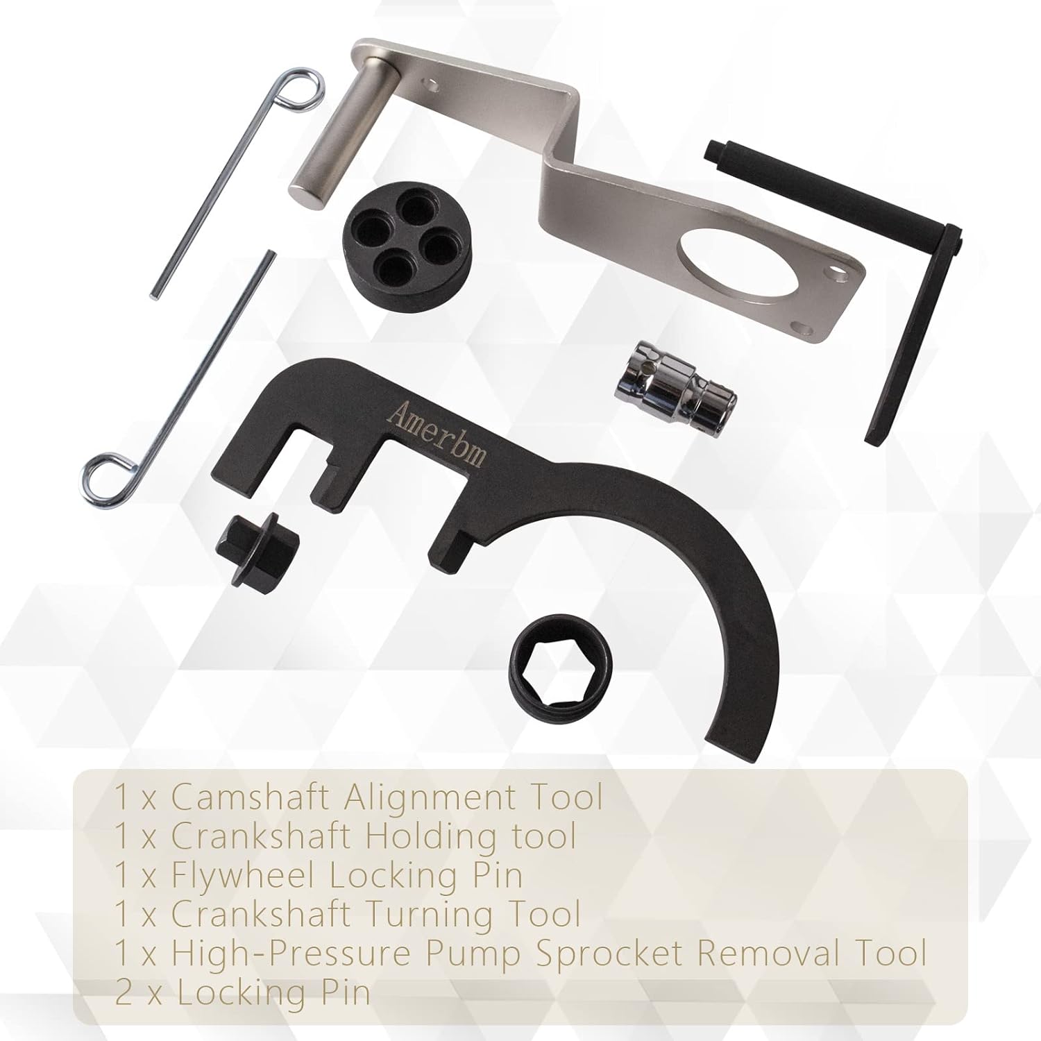 - Paket enthalten: 1 x Nockenwellen-Ausrichtungswerkzeug, 1 x Kurbelwellen-Haltewerkzeug, 1 x Schwungrad-Arretierstift, 1 x Kurbelwellen-Drehwerkzeug, 1 x Hochdruckpumpenrad-Ausbauwerkzeug, 2 x Sicherungsstift.