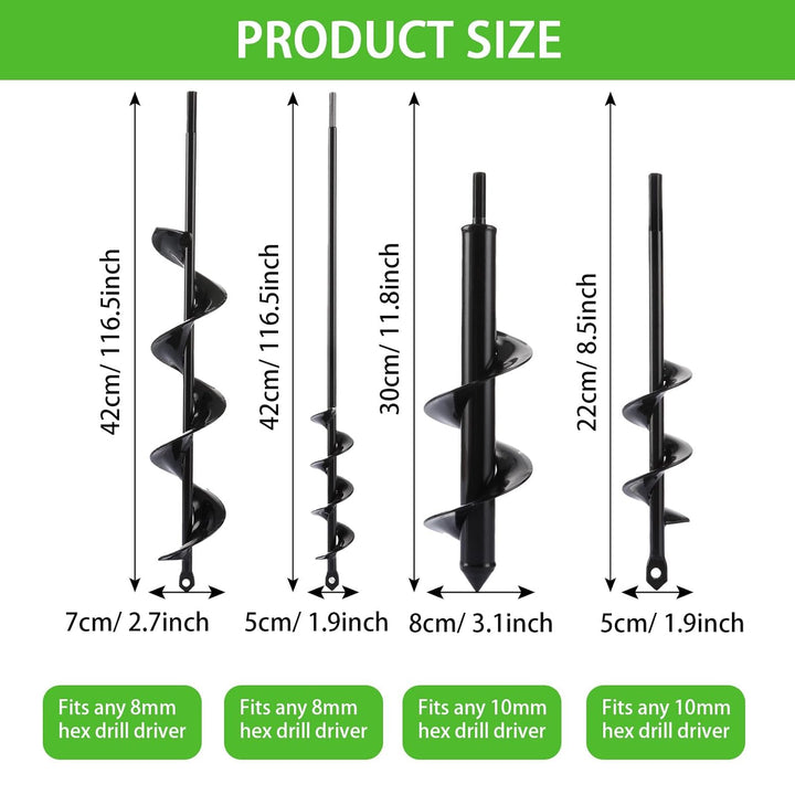 - 【PRODUKT DETAILS】Das Erdbohrer für Bohrmaschine umfasst 4 Stück schwere Gartenschnecken, die Grösse ist 8x30cm/7x42cm/4x42cm/4x22cm, 42cm verlängerte Gartenschnecke kann Sie vom Biegen und keine Rückenschmerzen mehr retten.
