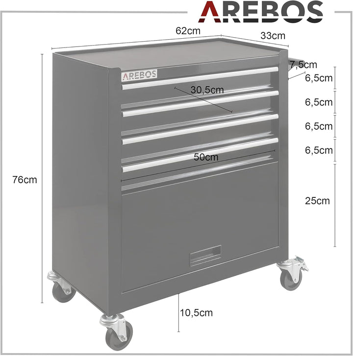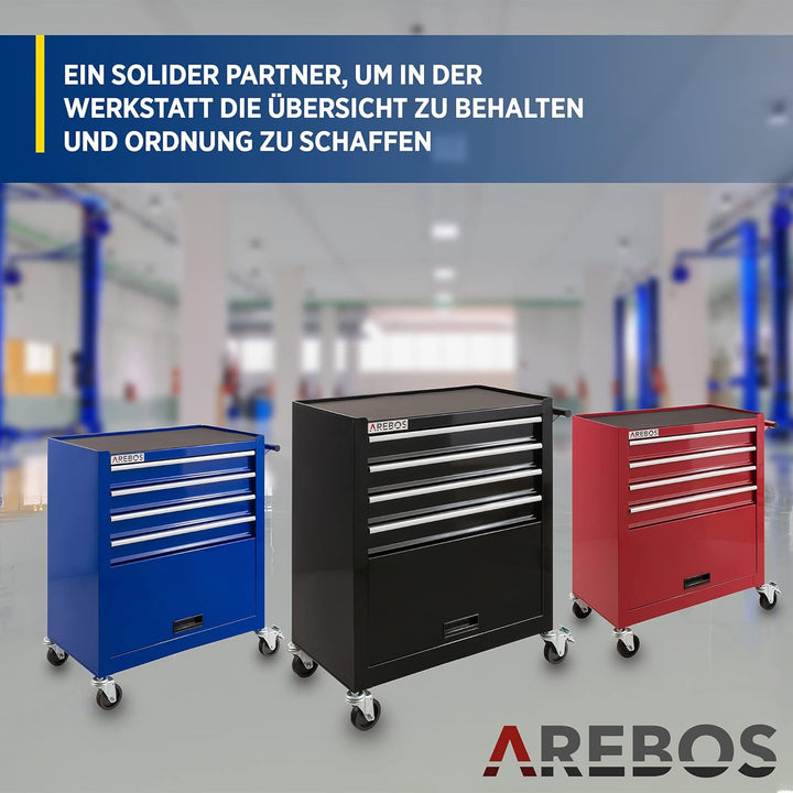 - [PERFEKT AUSGERÜSTET] Unser AREBOS Werkzeugwagen ist mit insgesamt 4 Schubladen und einem grossen Stauraum ausgestattet | Aus massivem Stahl gefertigt | Robuste und kratzfeste Arbeitsplatte | Schubfächer mit Kugelgelagerte Gleitschienen und