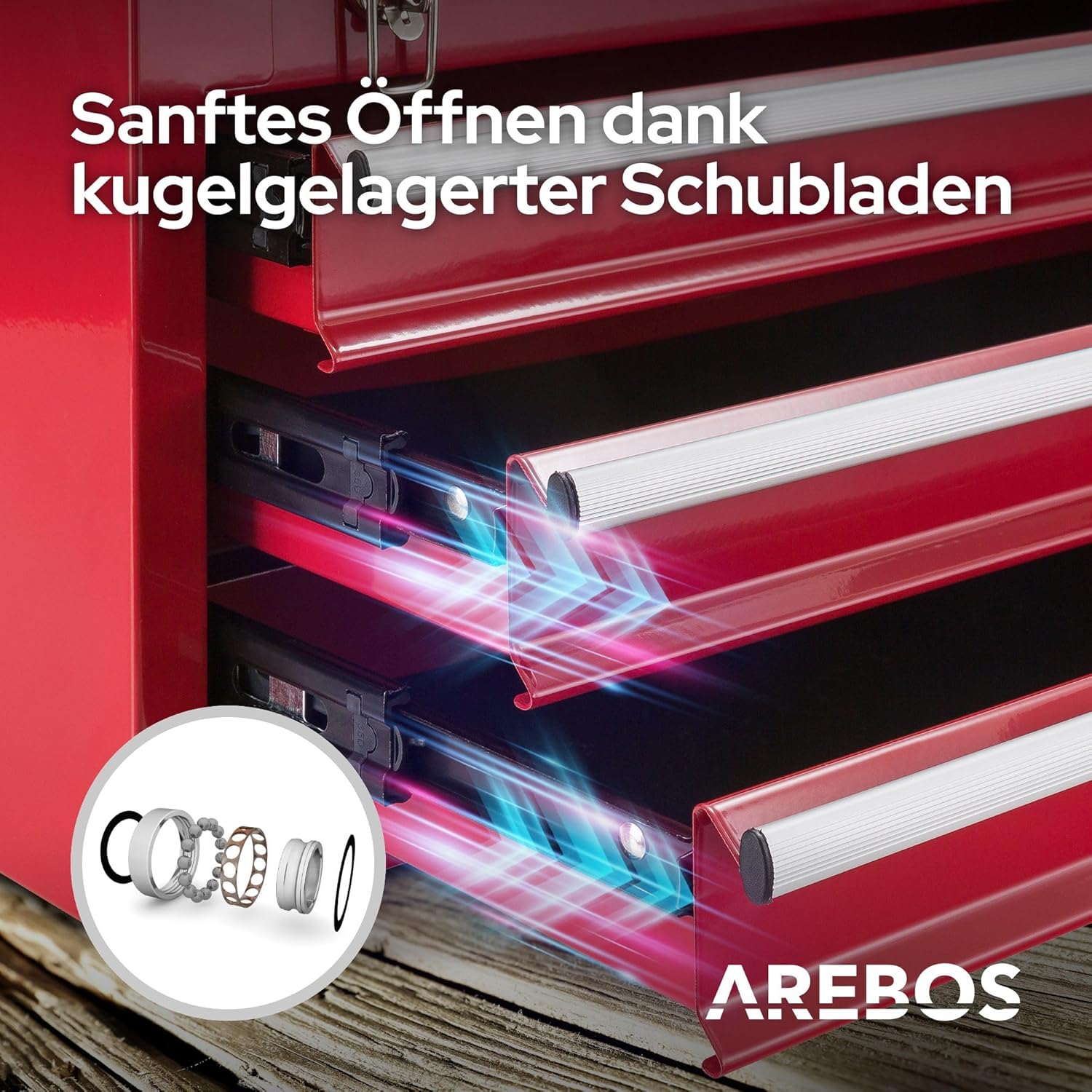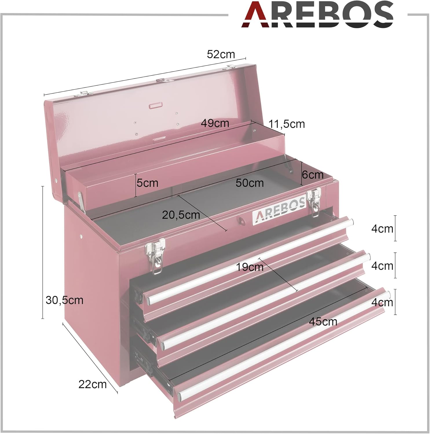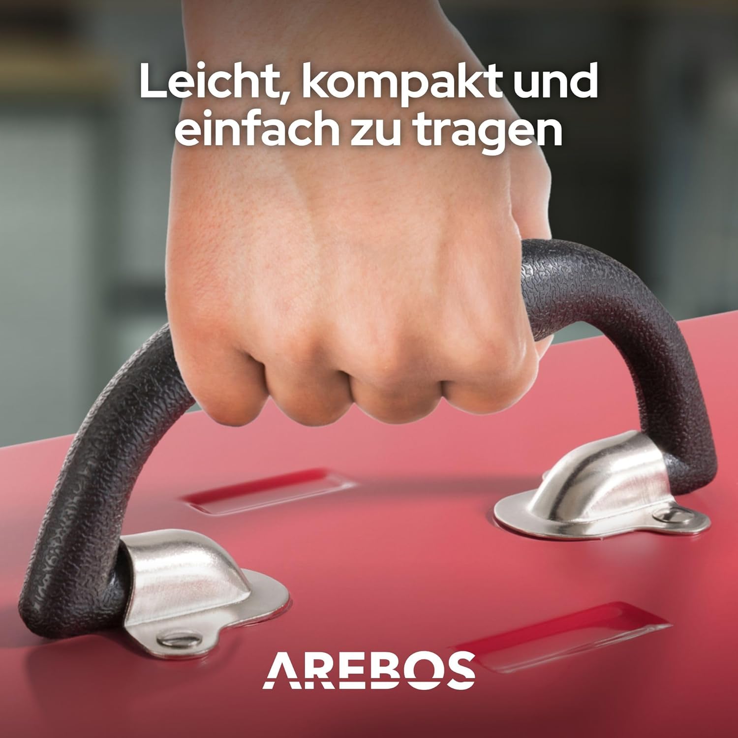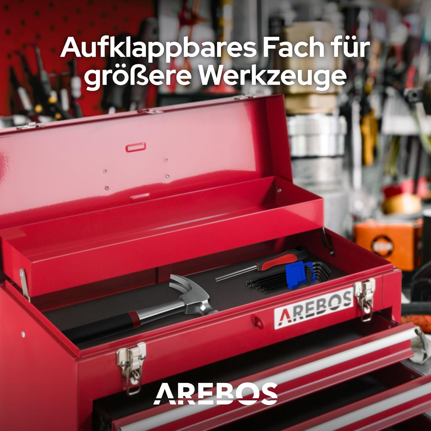 - [PERFEKT AUSGERÜSTET] Unsere AREBOS Toolbox ist mit insgesamt 3 Schubladen, einem aufklappbaren Fach und einem zusätzlichen Staufach im Deckel ausgestattet. | Aus massivem Stahl gefertigt | Robuste und kratzfeste Arbeitsplatte. | Schubfächer mit