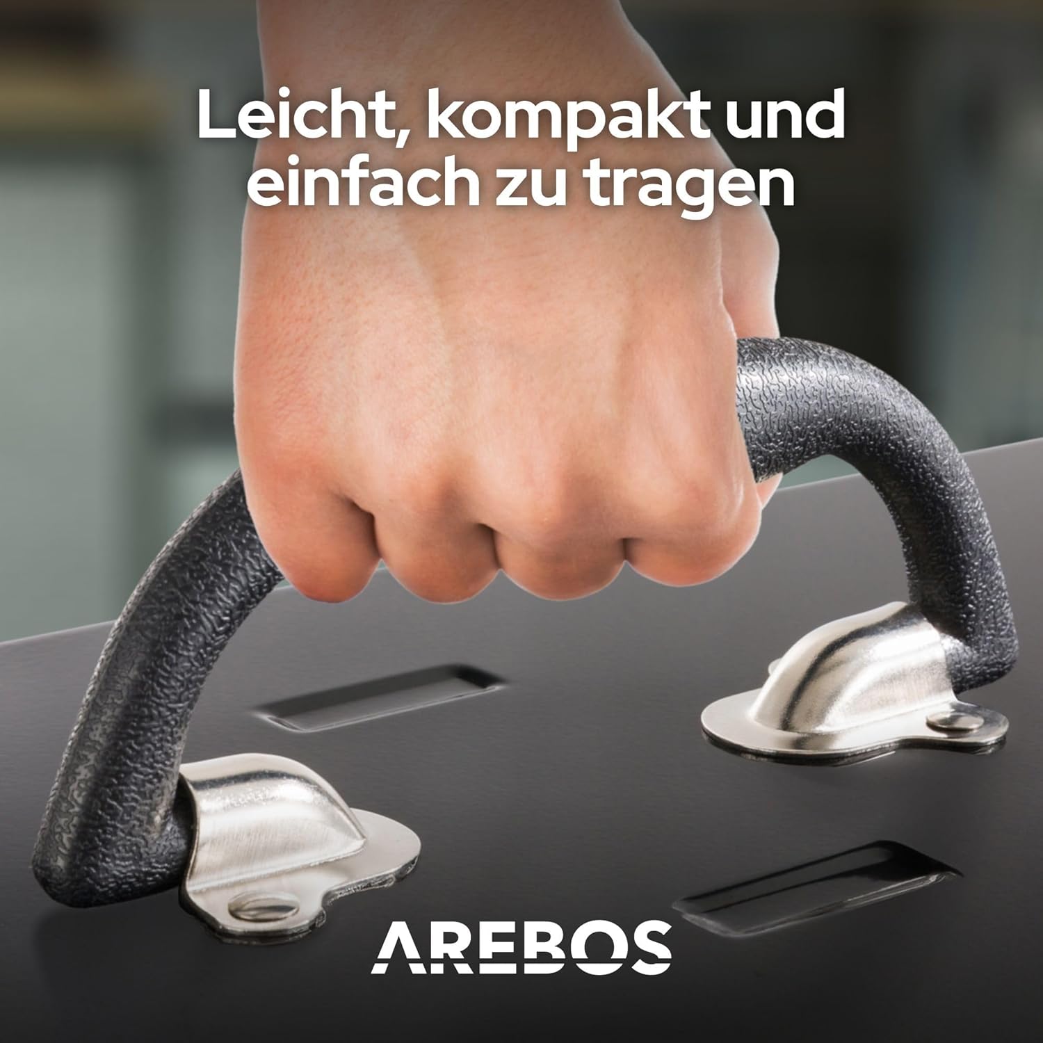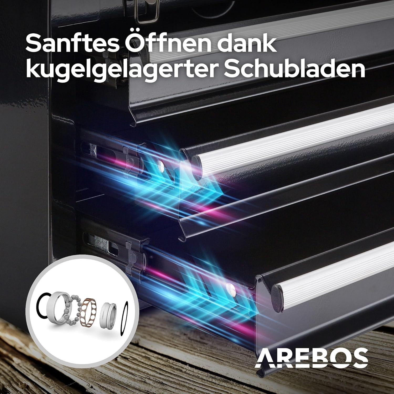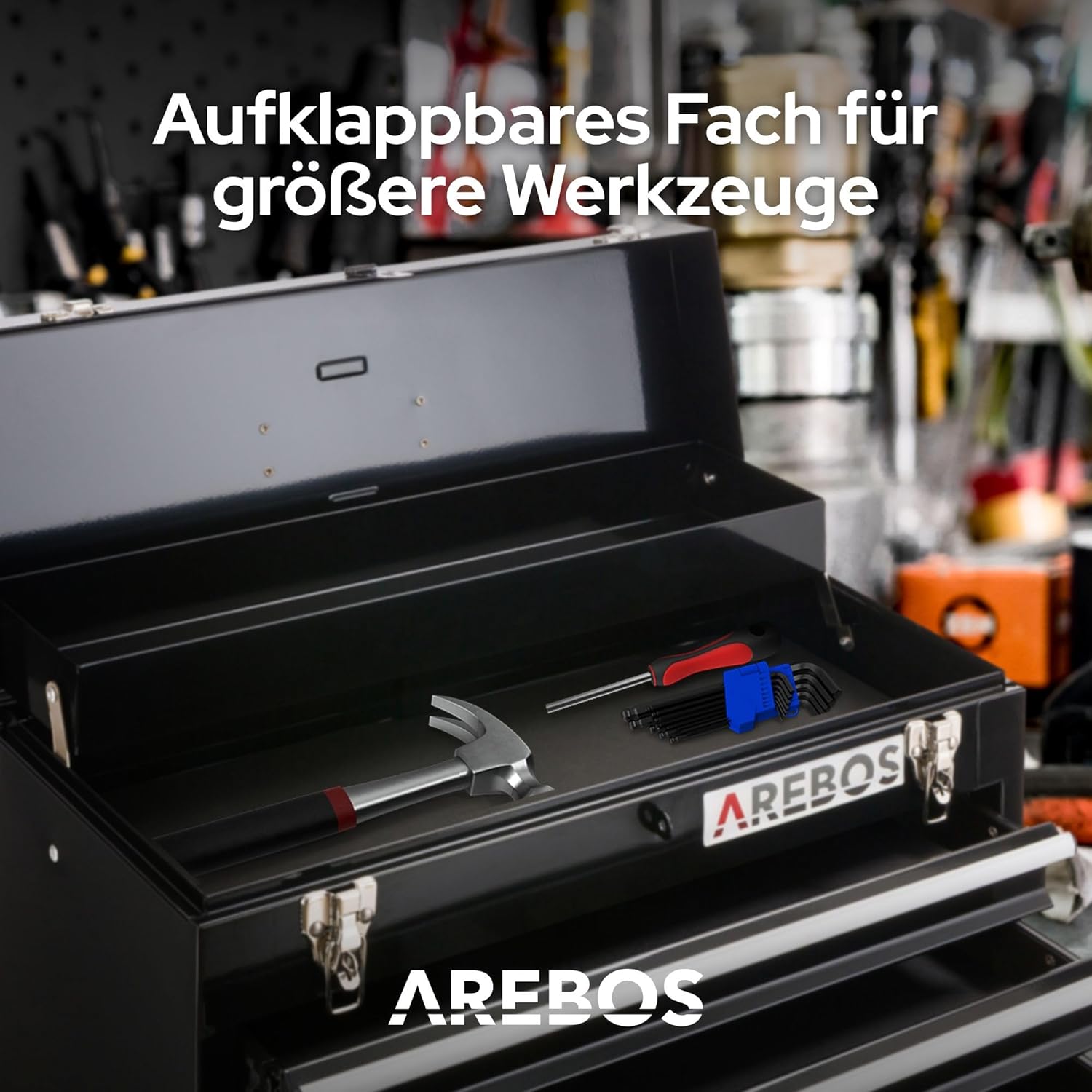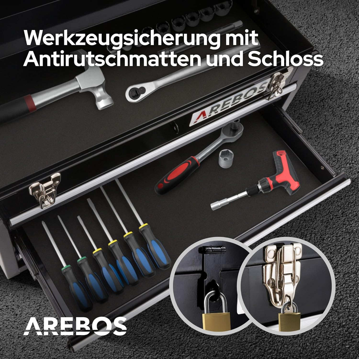 - [PERFEKT AUSGERÜSTET] Unsere AREBOS Toolbox ist mit insgesamt 3 Schubladen, einem aufklappbaren Fach und einem zusätzlichen Staufach im Deckel ausgestattet. | Aus massivem Stahl gefertigt | Robuste und kratzfeste Arbeitsplatte. | Schubfächer mit