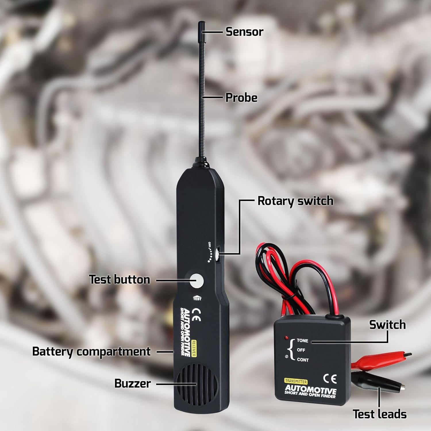 - 【Kurzschluss prüfen】 Empfänger: Ein-/Aus-Taste / Test-Taste / Sondenlänge: 7" flexible Sonde
