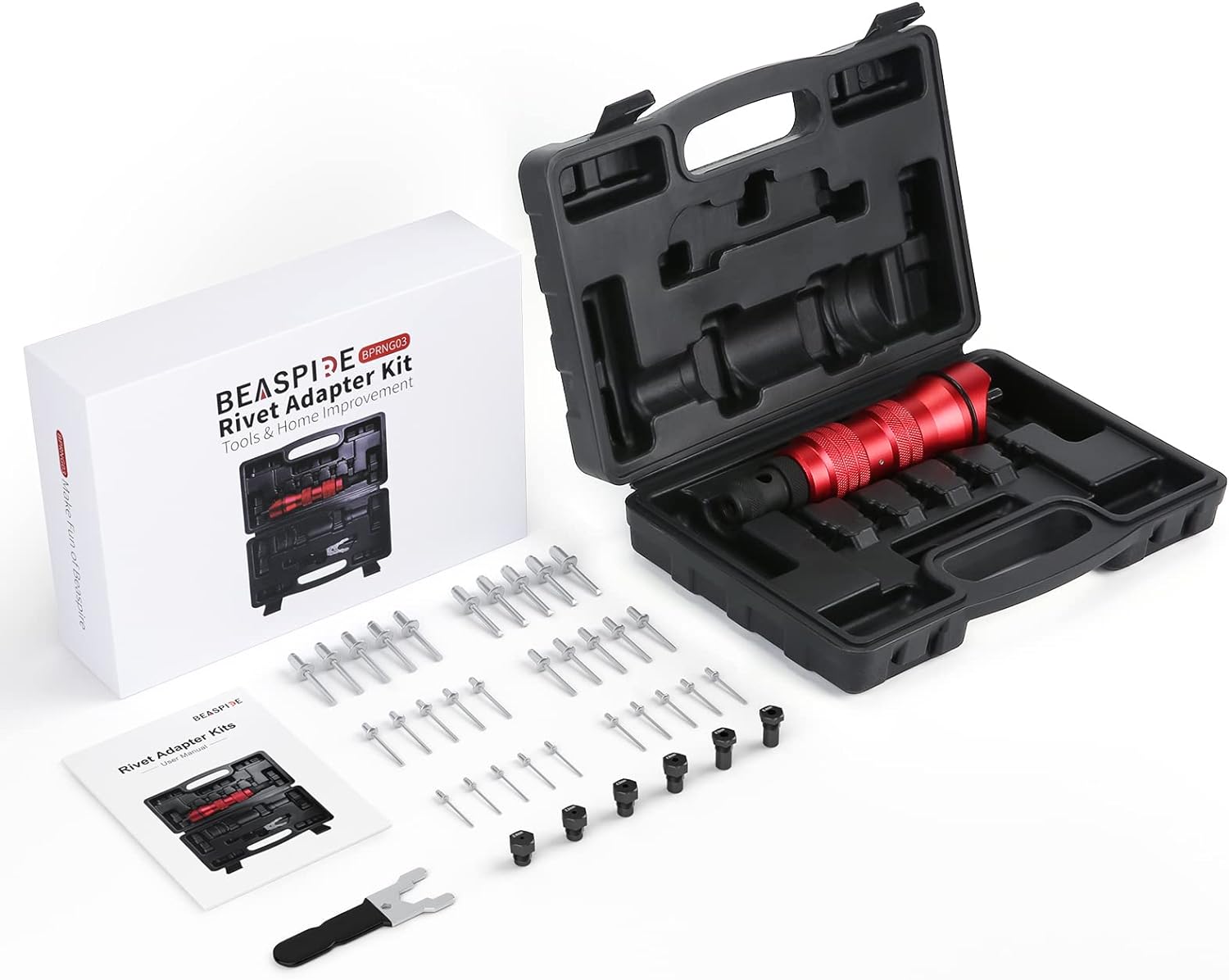 - 【Was können Sie bekommen】Beaspire Adapter Kit Enthält: 1 x Beaspire Elektrischer Blindnietbohrer-Adaptersatz (Nicht enthalten Elektrische Bohrmaschine), 6 x Nietköpfen, 30 x Blindnieten, 1 x Spannschlüssel für Zugdorne, 1 x handlicher