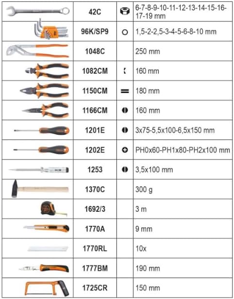 - Der Werkzeugkoffer enthält einen Satz Inbusschlüssel 96K/SP9 mm 1,5-10; Mehrzweckzangen in verschiedenen Grössen; Bolzenschneider 1082CM mm 160; Schraubendrehersatz 1201 mm 3x75 - 5,5x100 - 6,5x150 mm und vieles mehr