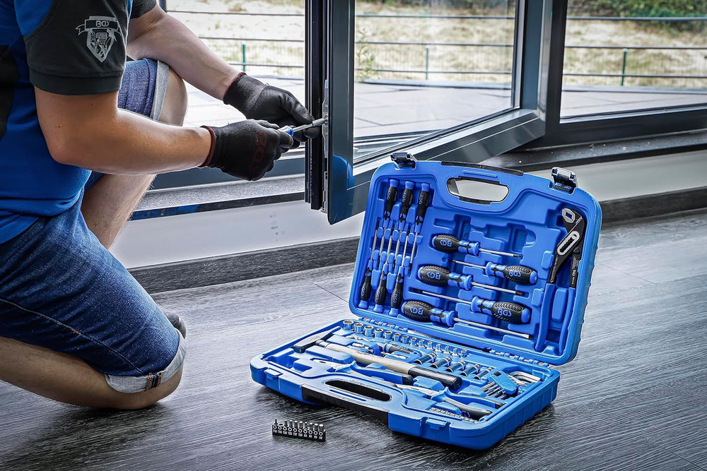 - Lieferumfang: BGS Systemkoffer | Umschaltknarre, feinverzahnt, 6,3 mm (1/4"), Länge: 155 mm | gekröpfte Ausführung, verchromt, matt, 2-Komponenten-Griff | Drehgriff für Bits, 6,3 mm (1/4"), Länge 200 mm, 2-Komponenten-Griff, mit Magnet (Art. 217) |