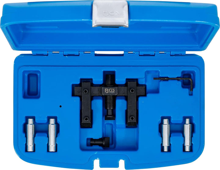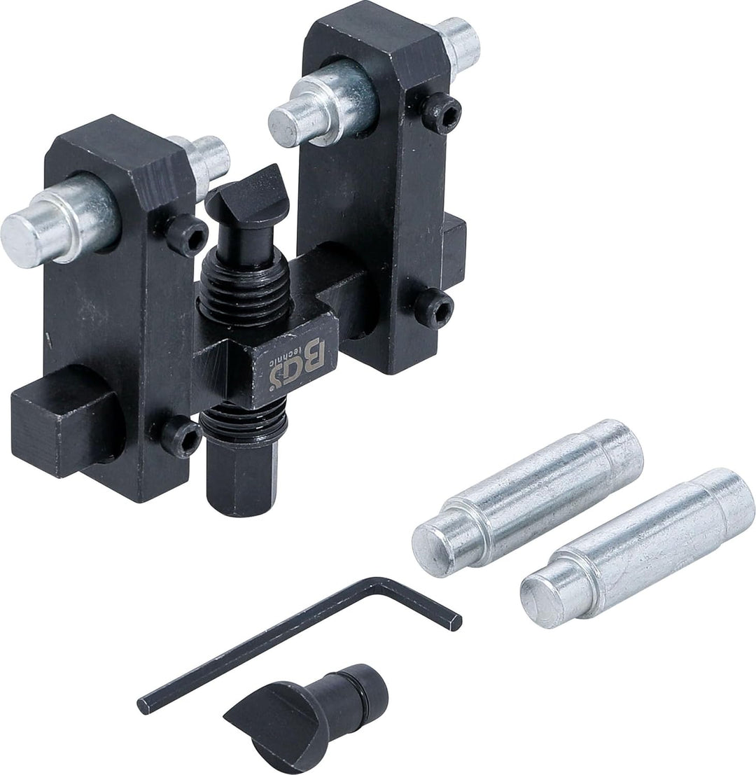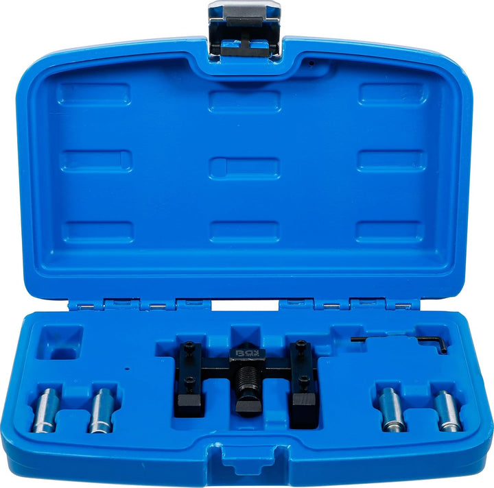 - mit 2 wechselbaren Spreiz-Einsätzen (5 mm und 8 mm Tiefe) und Führungsbolzen 8x10 mm (2x) und 10x12 mm (2x) für die Stossdämpferaufnahme am Radlagergehäuse beim Dämpferwechsel, Kugelgelenkaufnahme am Quer-/Dreieckslenker bei Demontage des