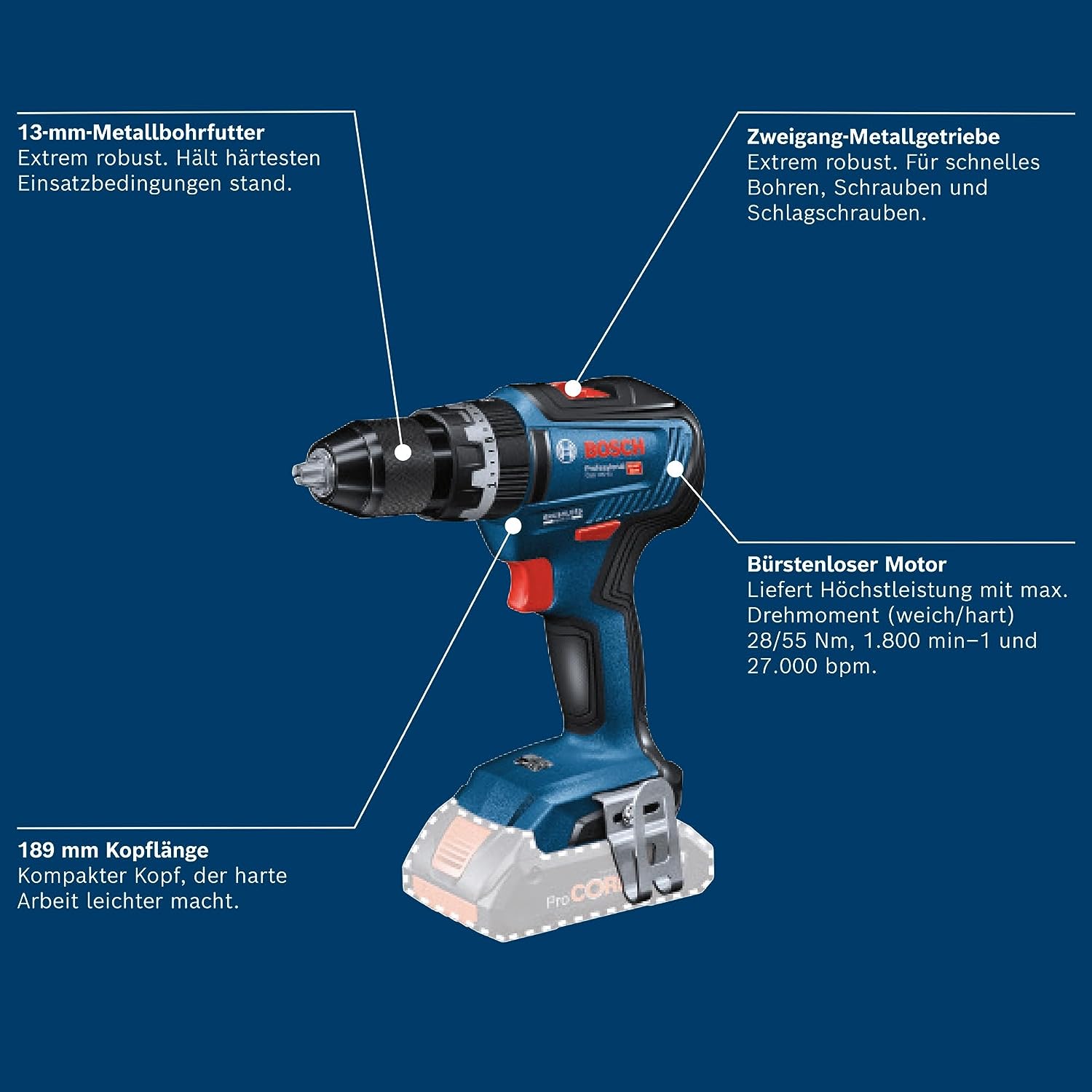 - Der Akkuschrauber GSB 18V-55 bietet professionelle Leistung dank 55 Nm Drehmoment und bürstenlosem Motor für noch längere Lebensdauer und erweiterte Batterielaufzeit
