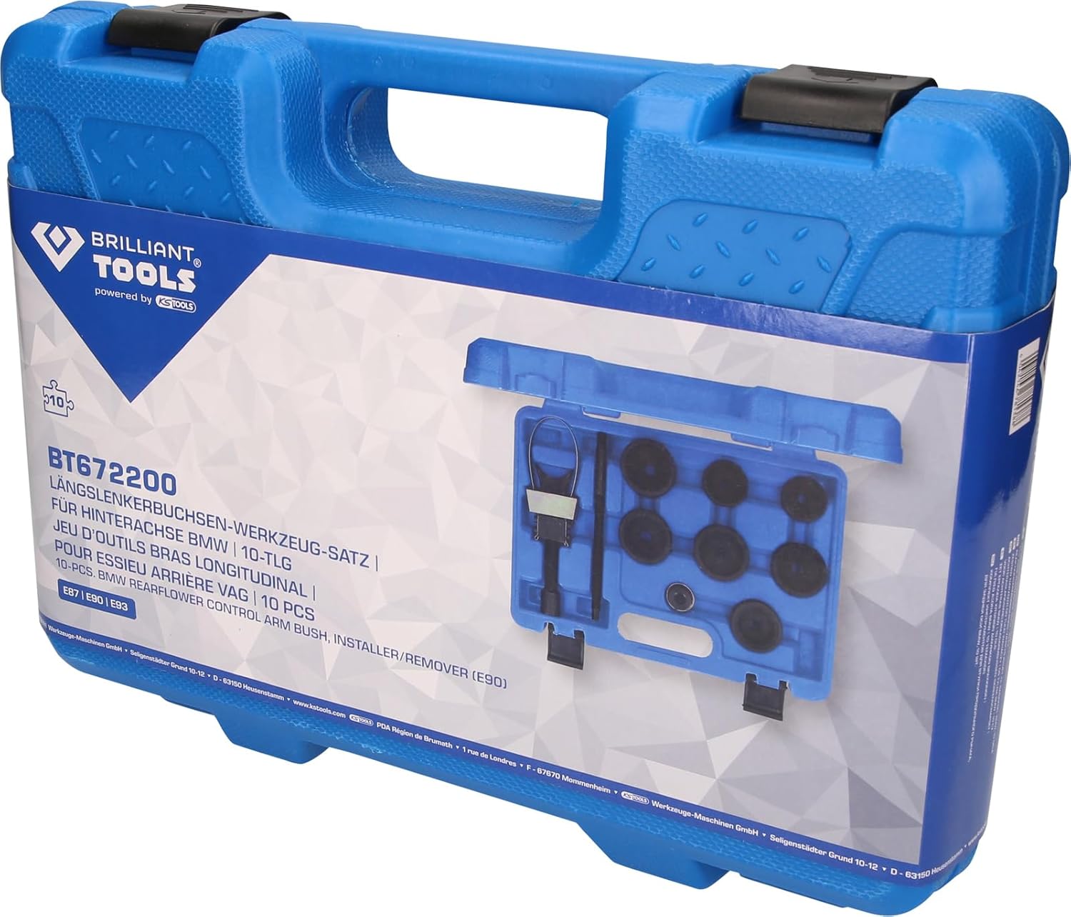 - Der BRILLIANT TOOLS Längslenkerbuchsen-Werkzeug-Satz BT672200 wird zum Wechseln der Längslenkerbuchsen sowie der Gummilager am Hinterachs-Radträger verwendet