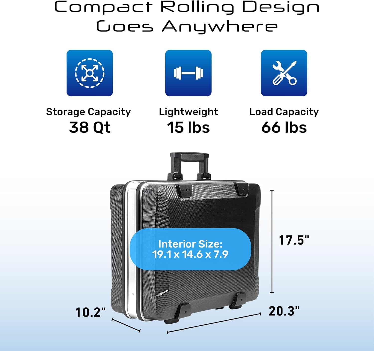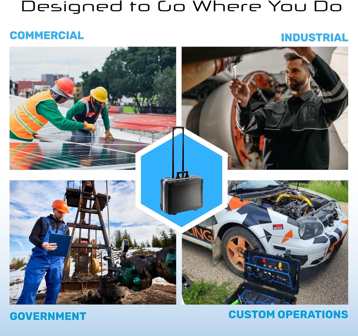 - Stabiler Werkzeugkoffer mit Teleskopgriff und Rollen für reisende Handwerker. Flexible Innenausstattung: insgesamt 37 Werkzeugeinsteckfächersowie ein variables Alu-Trennsteg-System in der Bodenschale