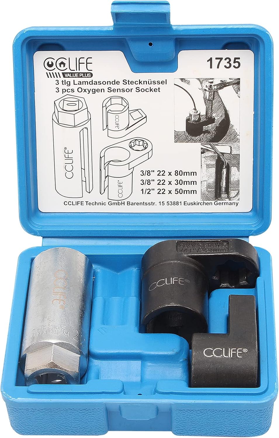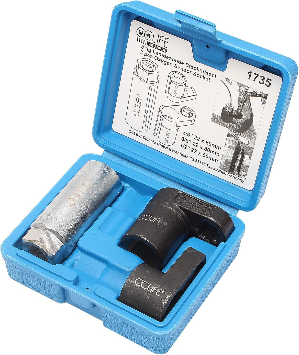 - Der Lambdasonden Schlüssel Satz enthält 3/8" und 1/2" Antriebe: enthaltene Grössen sind: 1x 3/8", 22 mm x 80mm, 1x 3/8", 22 mm x 30 mm, 1x 1/2", 22 mm x 50 mm