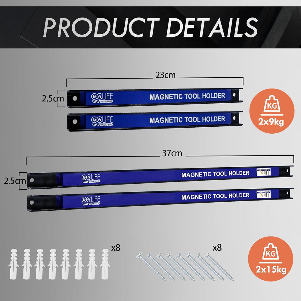 - Lieferumfang: Das Set enthält 2 Magnetleisten mit einer Länge von 37 cm und 2 Leisten mit einer Länge von 23 cm, inklusive Schrauben und weiterem Zubehör. Mehrere Magnetleisten können miteinander verbunden werden, um eine grössere Haltefläche zu