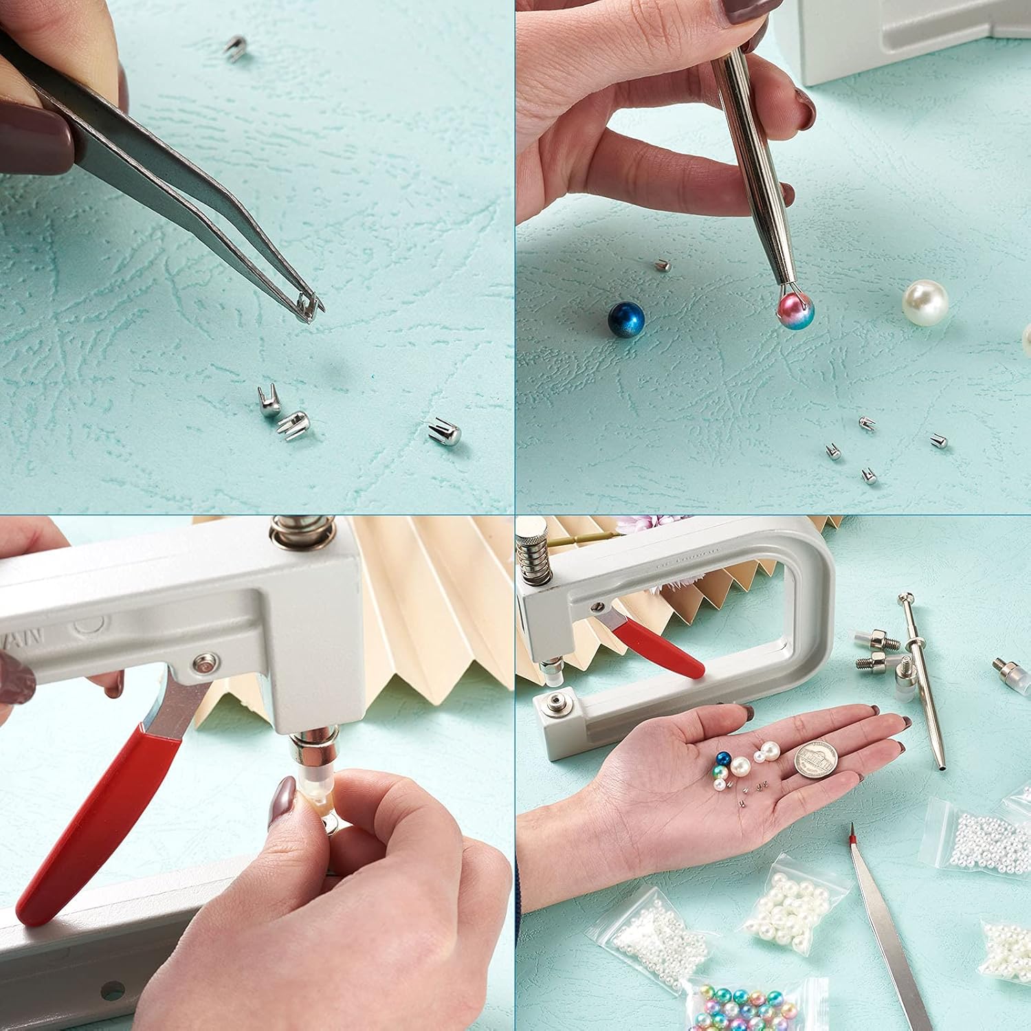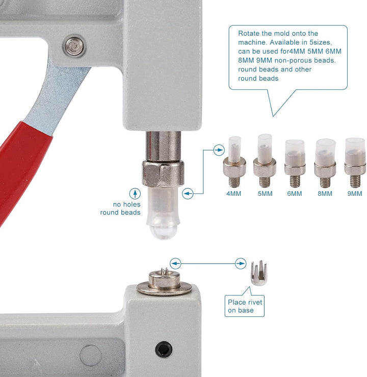 - Anwendung: Zunächst die richtige Form auf die Maschine. Legen Sie die Perle in die Form. Drittens platzieren Sie die Niete auf der Basis. Befestigen Sie die Perlen an Ihren Bastelarbeiten.