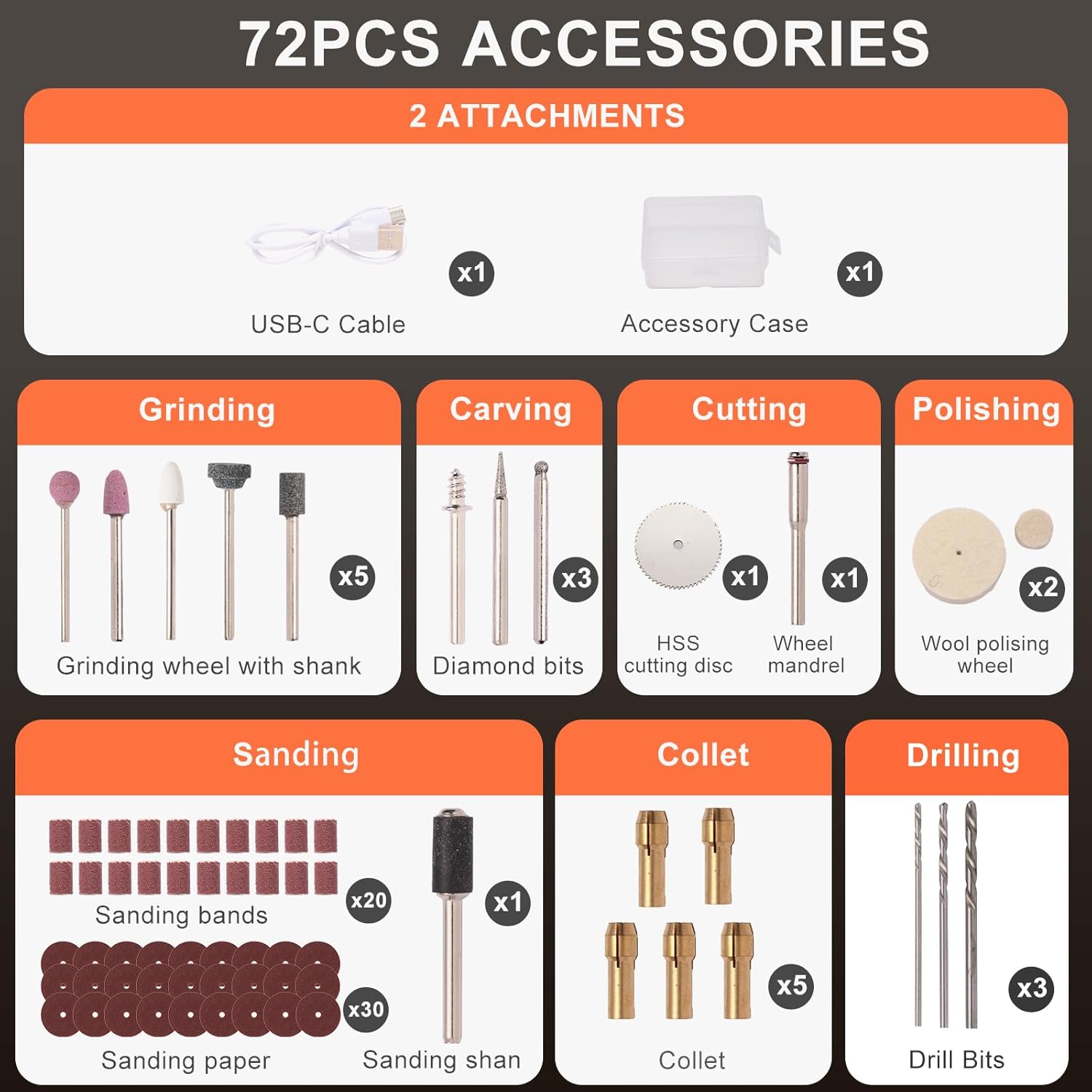 - Vielseitiges Drehwerkzeug-Set: Dieses Drehwerkzeug-Set enthält ein leistungsstarkes und geräuscharmes Drehwerkzeug mit 72 der beliebtesten Elektro-Drehwerkzeug-Zubehörteile für feine Heimwerkerarbeiten. Ideal zum Schnitzen, Schleifen, Schleifen,