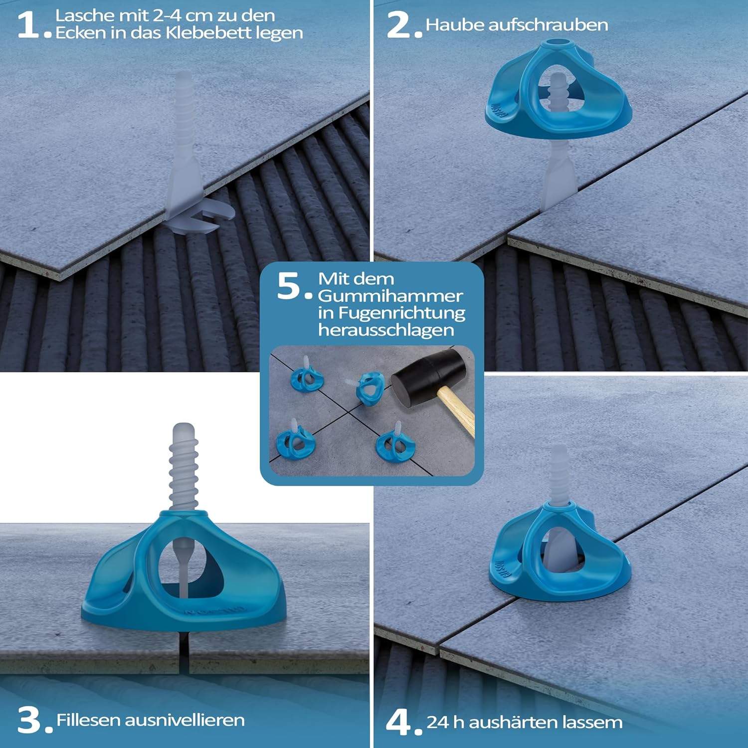 - Das System ermöglicht eine einfache und effiziente Ausrichtung der Fliesen, wodurch Unebenheiten und Höhenunterschiede vermieden werden.