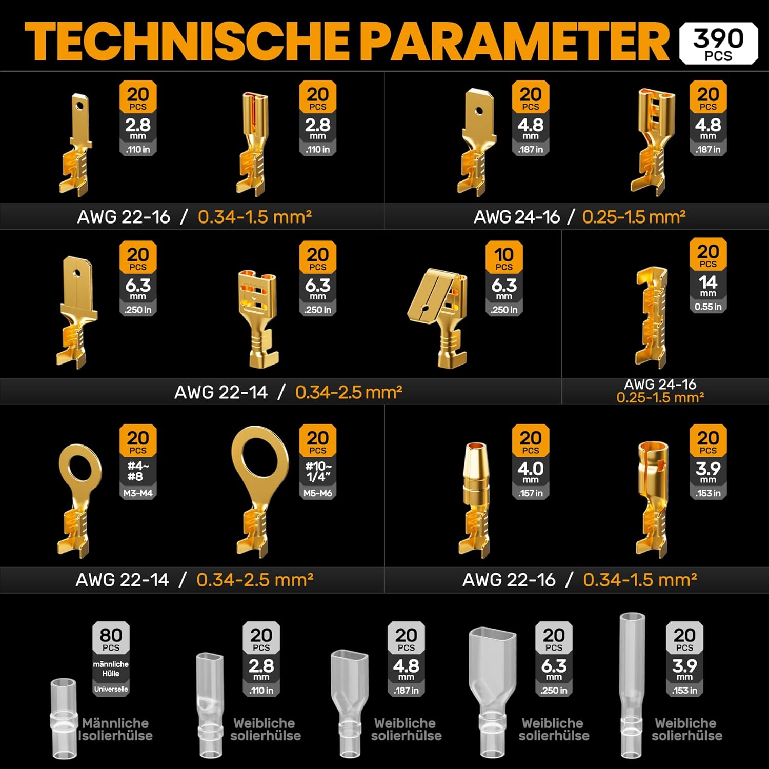 - 🧰【Typ und Grösse】12 Arten Flachsteckhülsen Set (Steckbreite 2,8 mm, 3,9 mm, 4,8 mm, 6,3 mm) für 0.25-2.5 mm²-Kabel. Zur einfachen Aufbewahrung und Sortierung von Kabelanschlüssen wird eine tragbare Aufbewahrungsbox mitgeliefert.