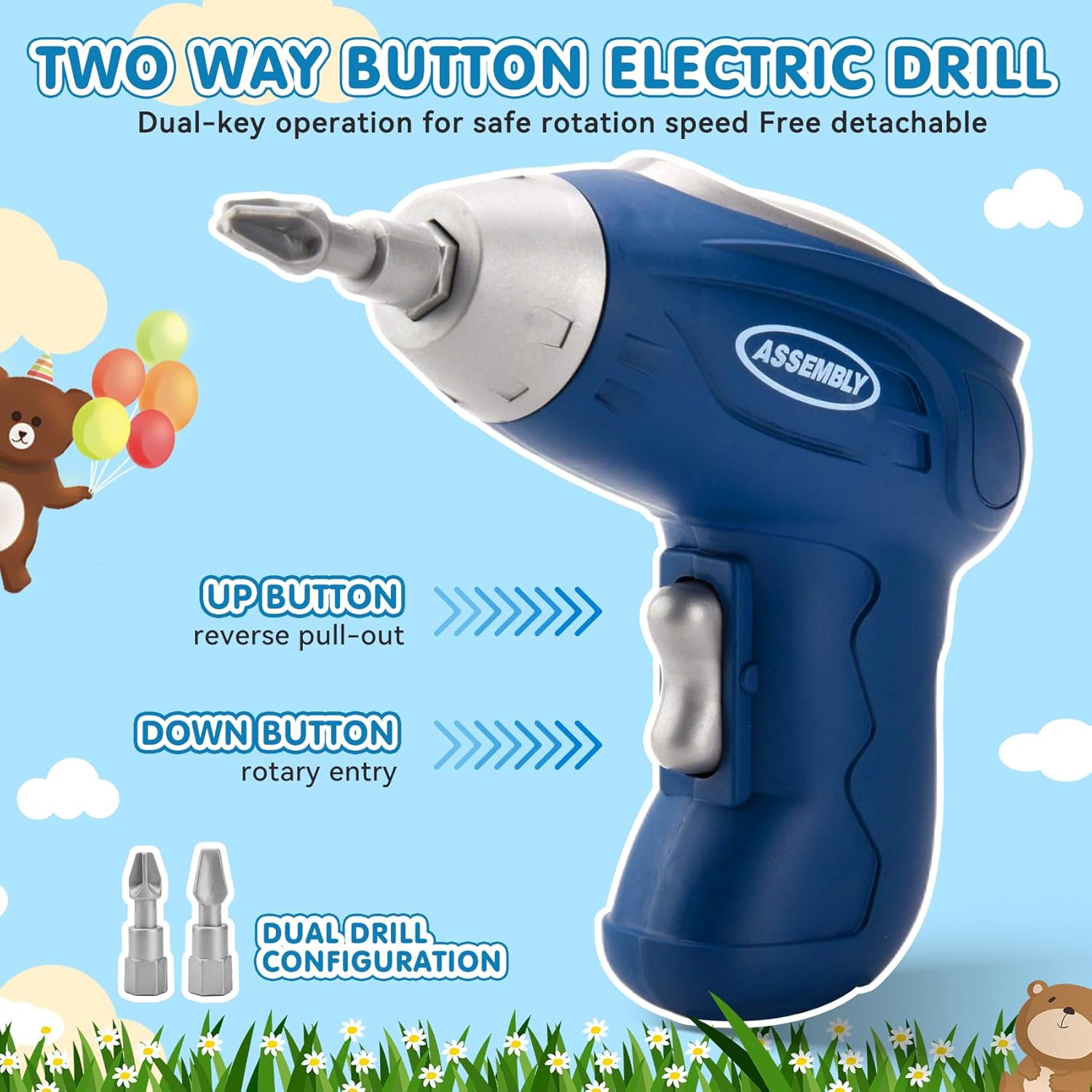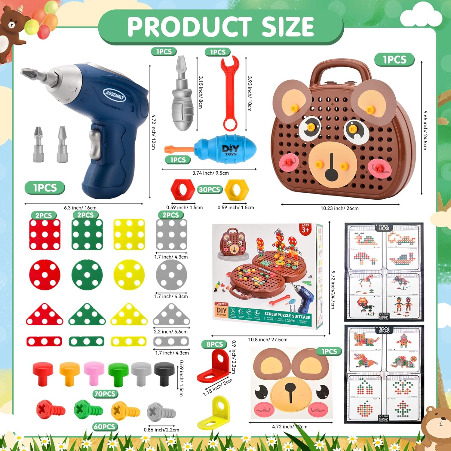 - 206PCS KINDERSPIELZEUG: Montessori spielzeugkiste Enthält 1* Elektrische Bohrmaschine für Kinder (Batterien nicht enthalten), 1* Schraubendreher, 1* Schraubenschlüssel, 1* Bärenaufkleber, 70* Pilznägel, 30* Muttern, 60* Schrauben, 40* geometrische