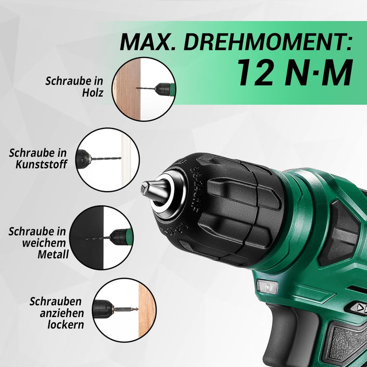 - 8V professioneller LED-Bohrschrauber kann verwendet werden, um Löcher in Holz und Kunststoff zu bohren oder Schrauben festzuziehen/zu lösen. Drücken Sie den Schalter, um die Geschwindigkeit des Bohrers einzustellen.Die maximale Leerlaufgeschwindigkeit